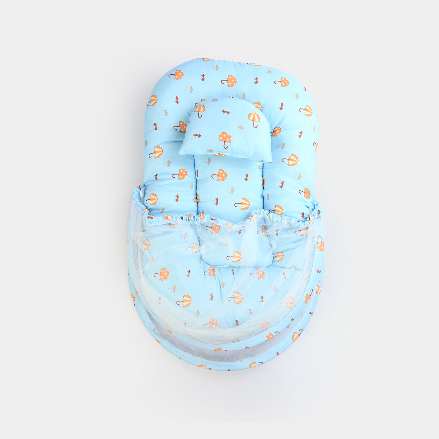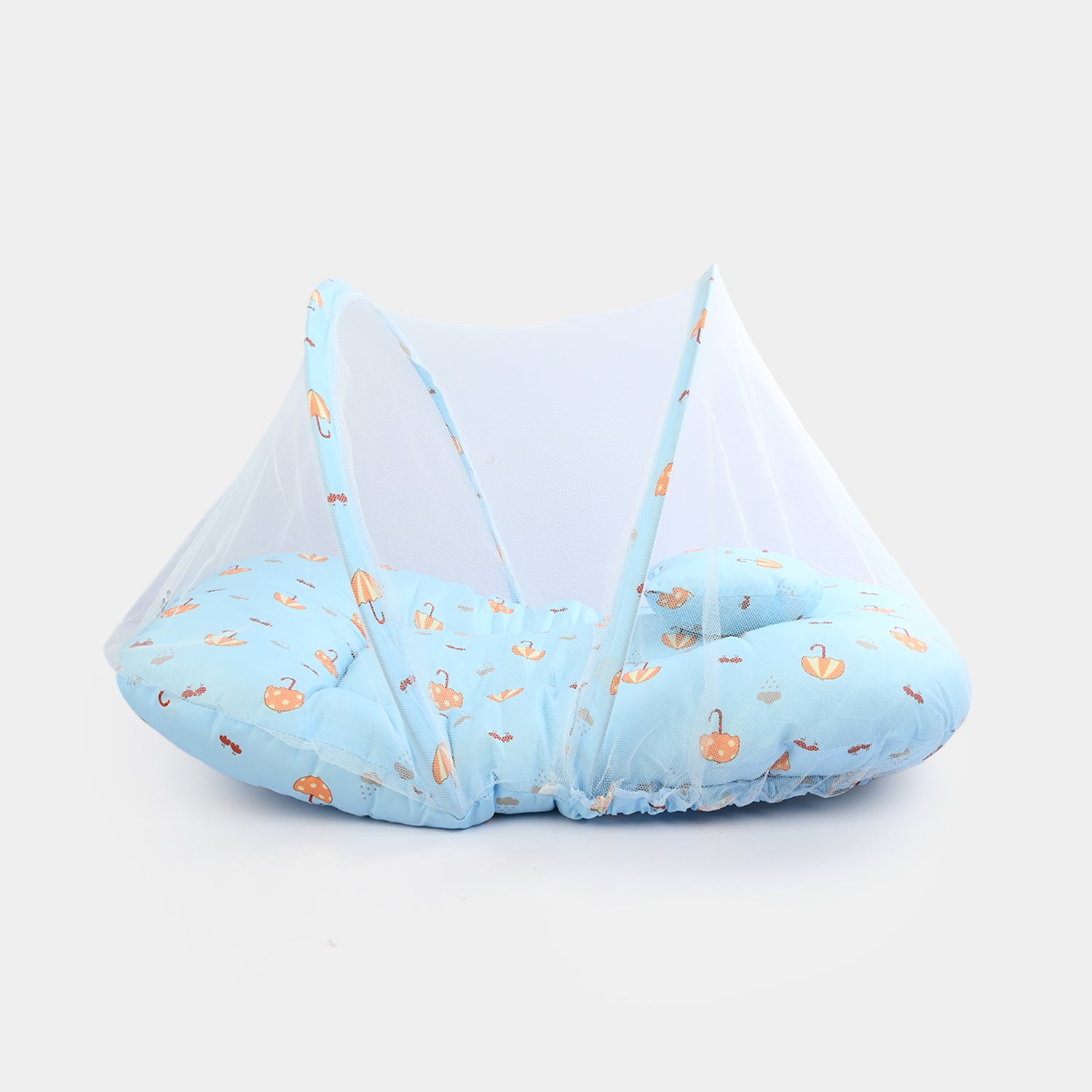 Infant umbrella bed featuring a lightweight frame, a comfortable sleeping area, a pillow, and an attached mosquito net, perfect for safe, cozy everyday naps or travel.
