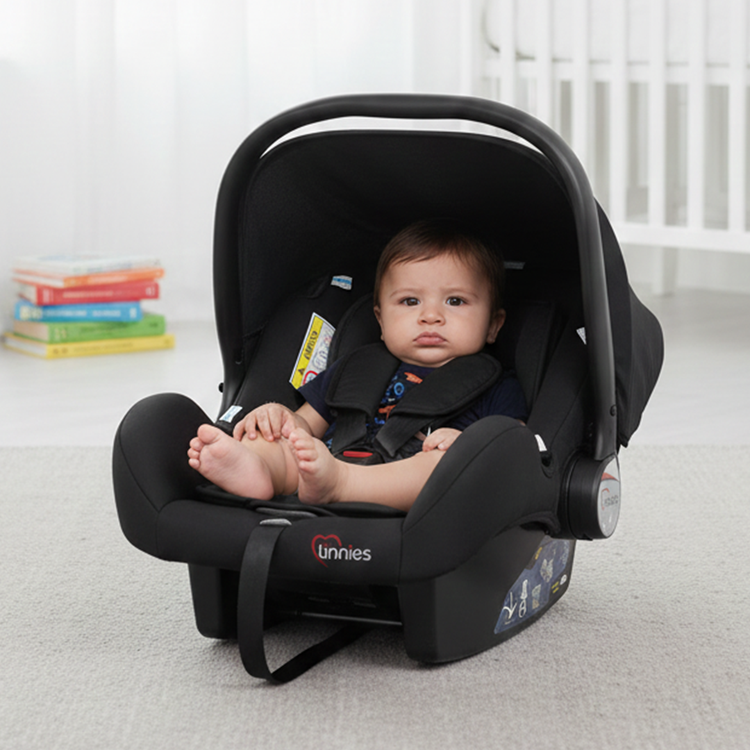 Offering optimal comfort and security for your baby, Tinnies' light and portable Carry Cots come in a variety of designs and colors with a sturdy base. This model features a retractable canopy to block out the sun and provide privacy while sleeping and can be used as a car seat for secure travel. Additionally, it has a double-layered cushion and a 3-point harness to keep your little one safe.