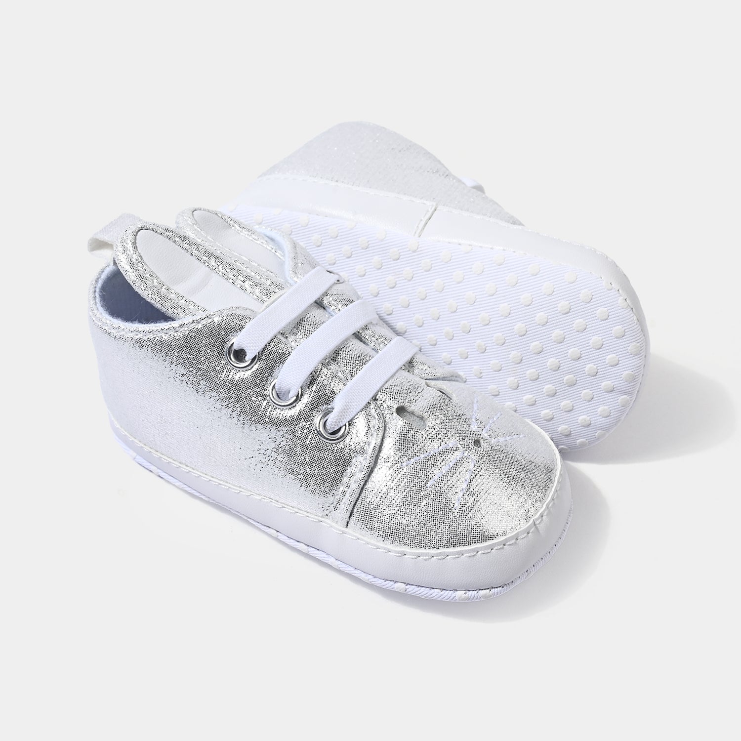 Adorable silver shoes featuring bunny ears and laces for easy wear and a secure fit.