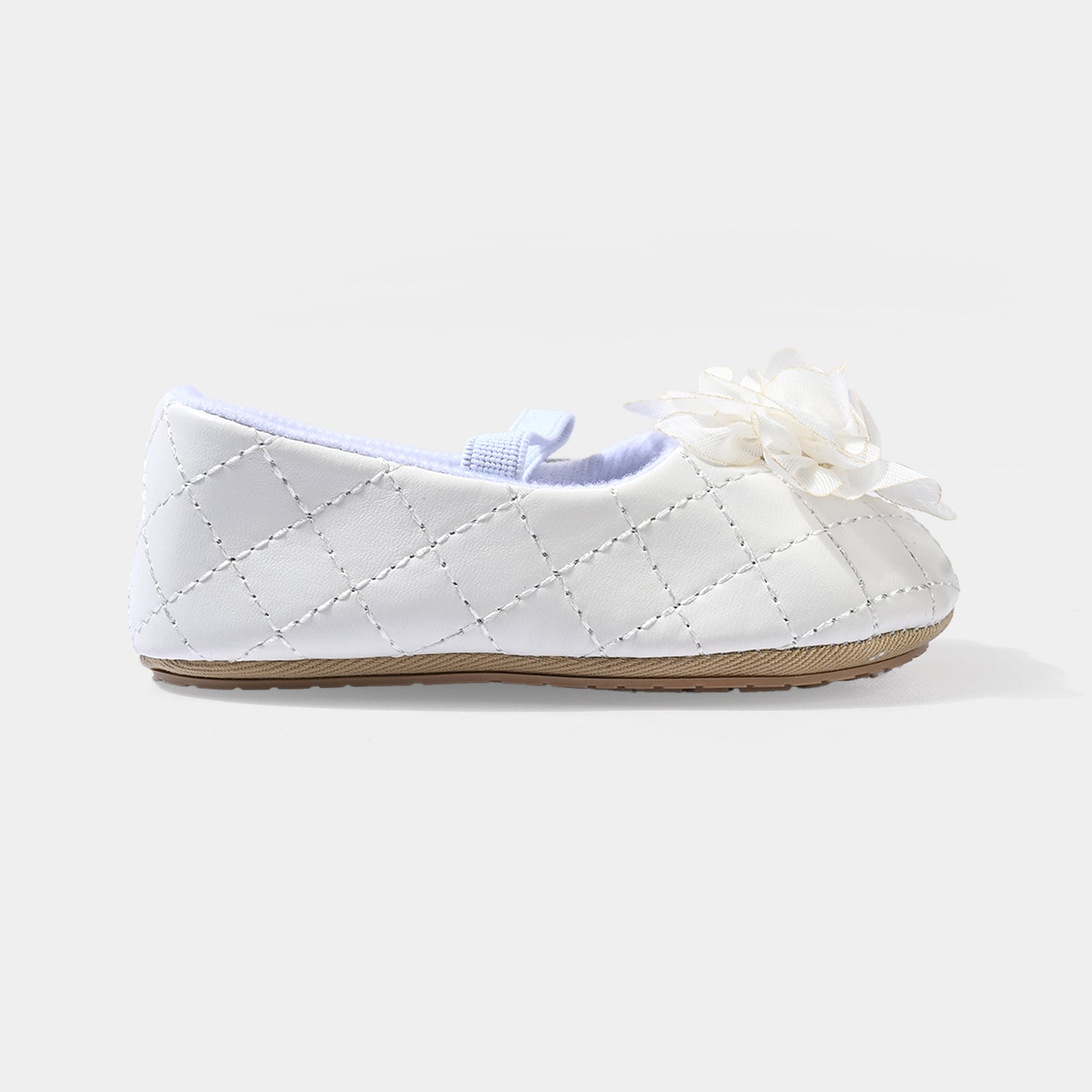 White shoes featuring a floral embellishment on the front and an elastic strap for easy wear and secure fit.