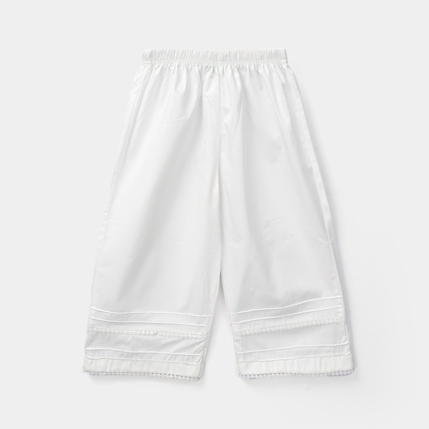 Infant girls’ cotton culottes with pleats and lace detailing for a cute and comfortable look.