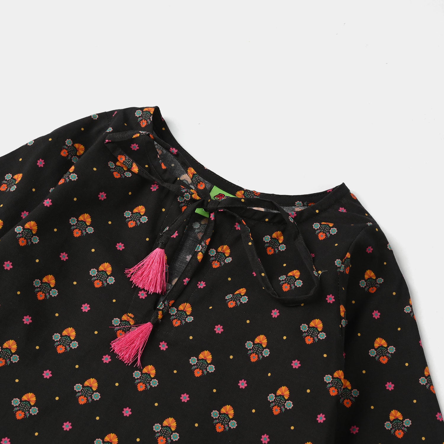 Infant girls black cotton printed kurti featuring a round neck with tassel detailing, full sleeves with lace embellishments, and a rounded hem with lace finish, perfect for everyday wear.