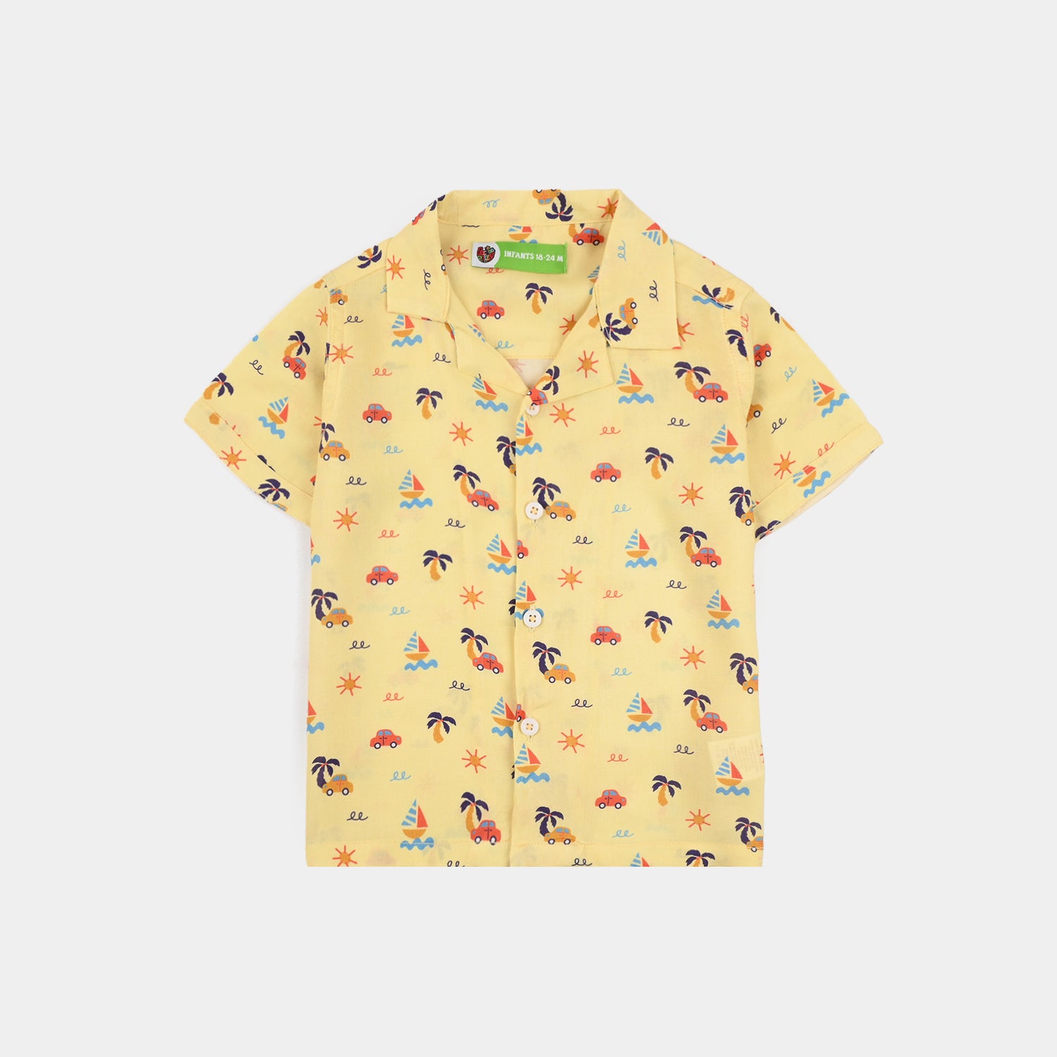 Infant boys’ viscose nightwear in yellow featuring a collar, front open design, half sleeves, matching bottoms, and an all-over print, perfect for a comfortable and cozy sleepwear look.