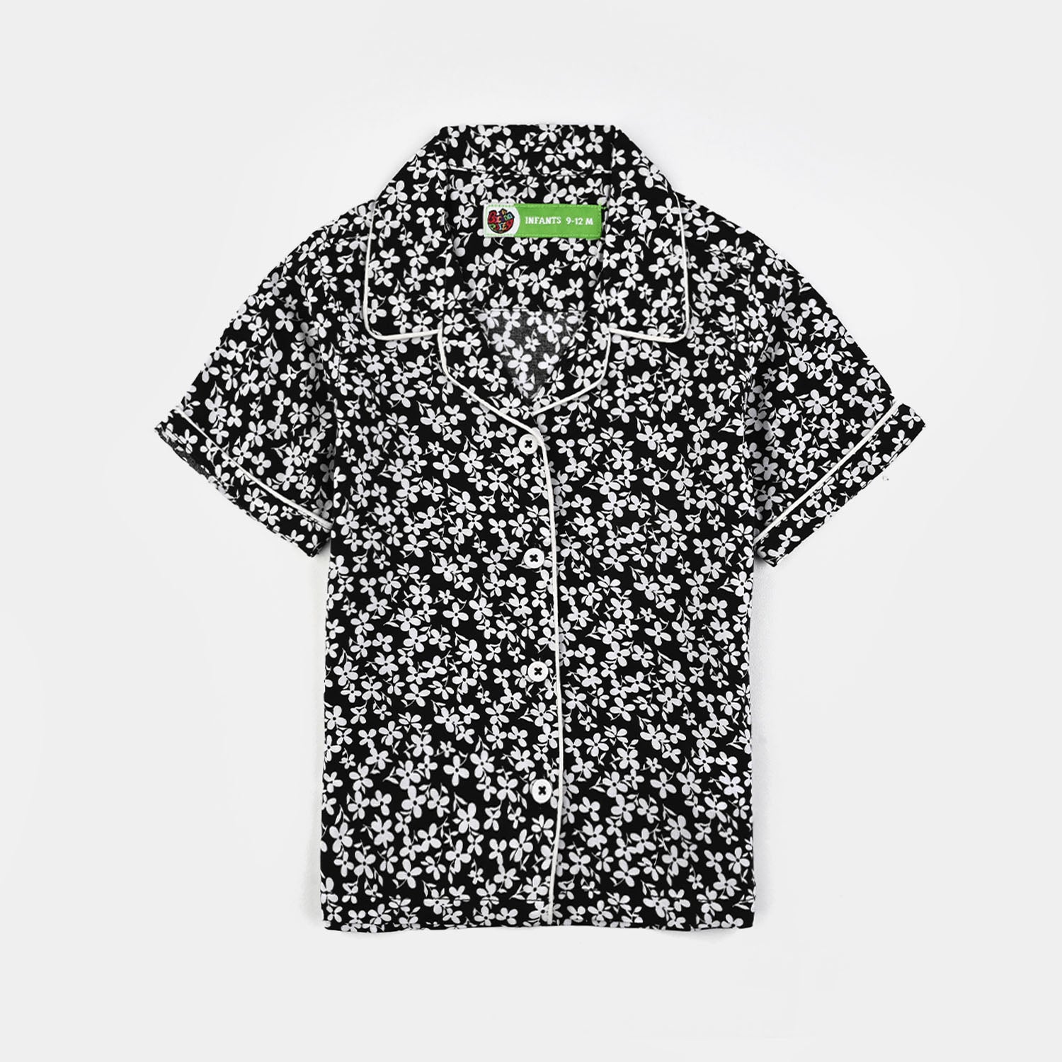 This Basic Black Girls Viscose Night Suit in a white floral print features a front-open shirt with a collar and half sleeves, paired with matching trousers. Soft and breathable, it ensures a cozy and comfortable night’s sleep.