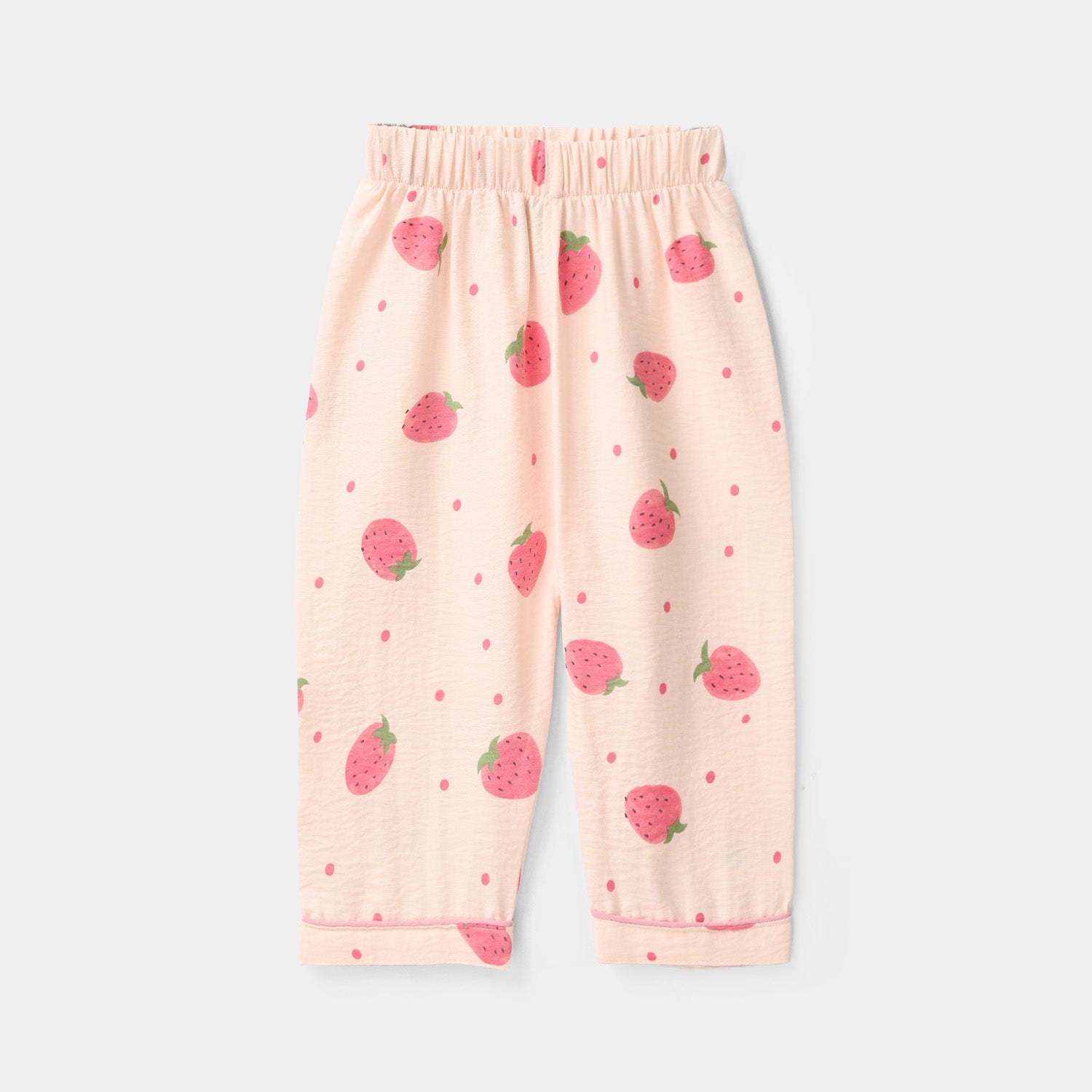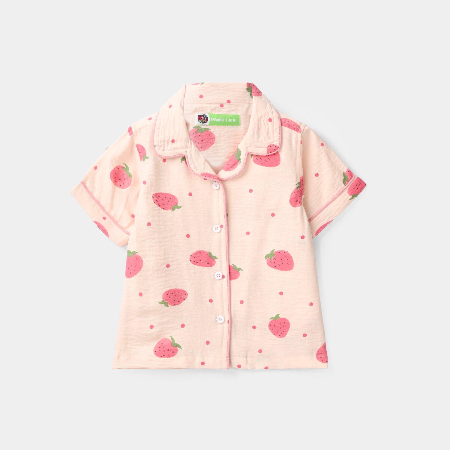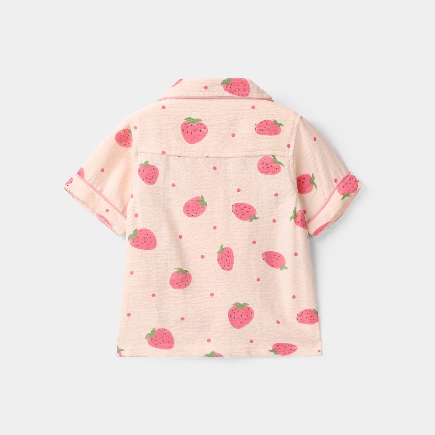 Infant girls’ light pink nightwear in viscose with an all-over strawberry print, featuring a collar, front button opening, half sleeves, and matching trousers for a comfy bedtime look.