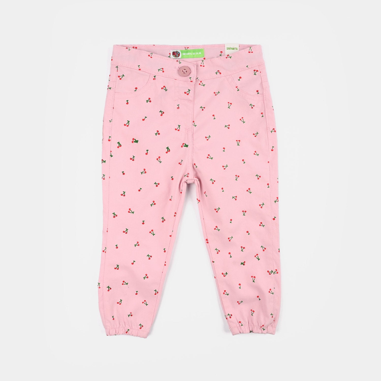 Infant girls’ cotton twill pants in cherry pink featuring an all-over print, elastic waistband, and relaxed fit, perfect for a comfortable and playful everyday look.