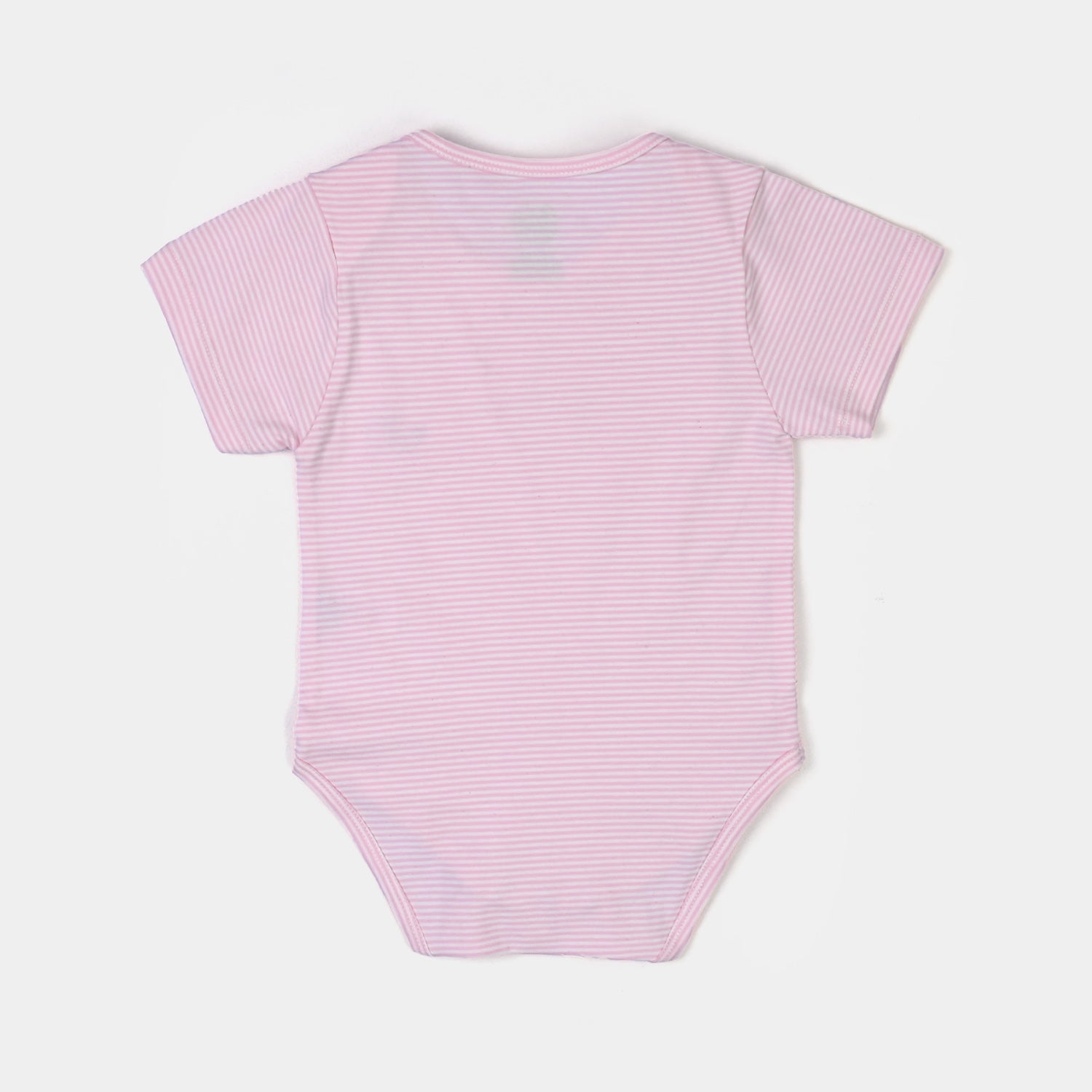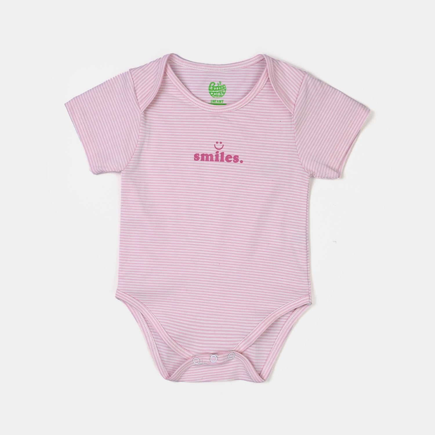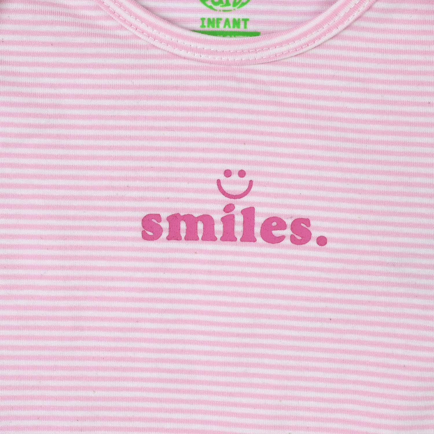 Pink infant girls’ romper with all-over stripes, half sleeves, and “Smile” text on the front, designed with easy diaper-change access for everyday comfort.