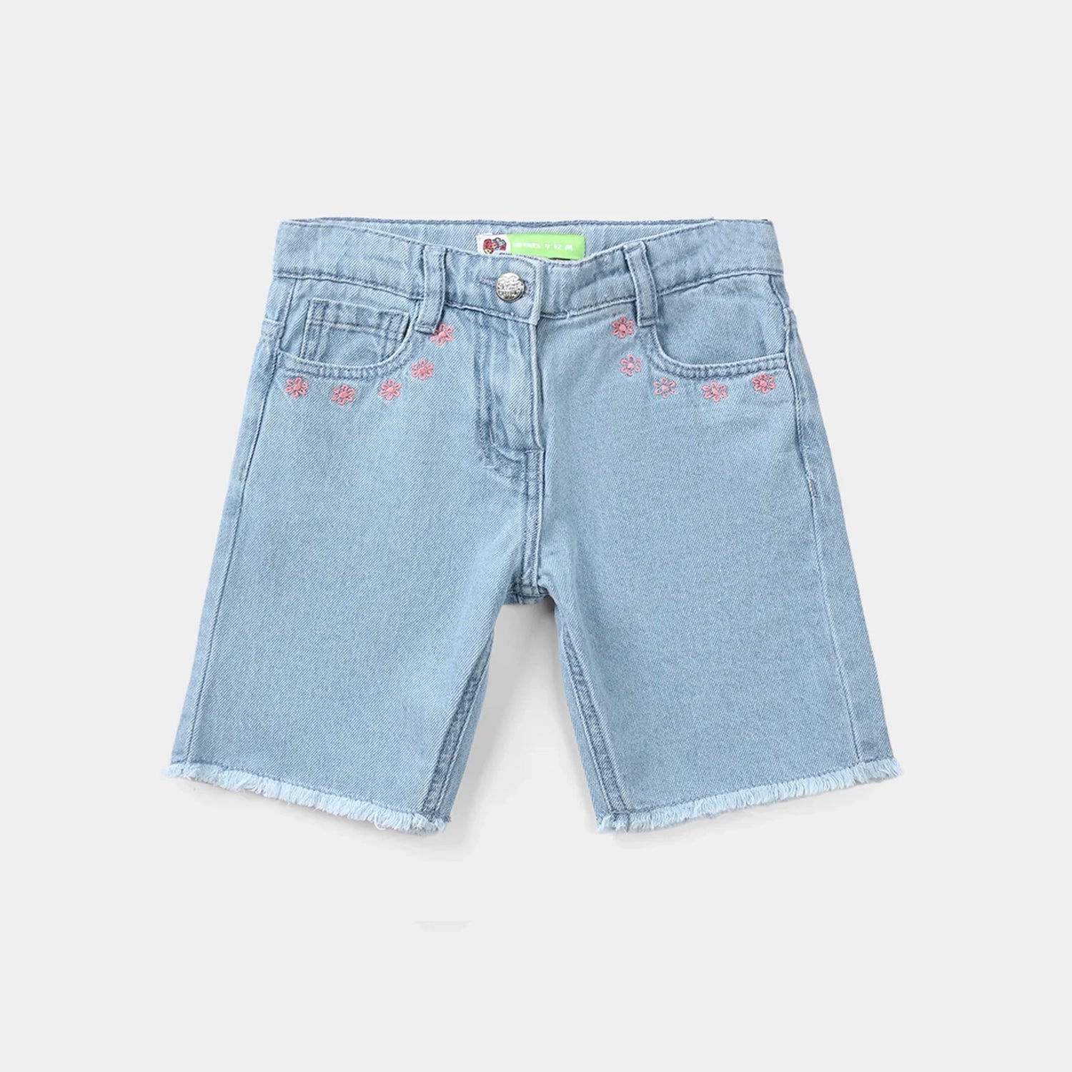 These blue denim shorts feature floral embroidery on the pockets and a ripped hem and can be paired with t-shirts or tops for a casual, stylish look.