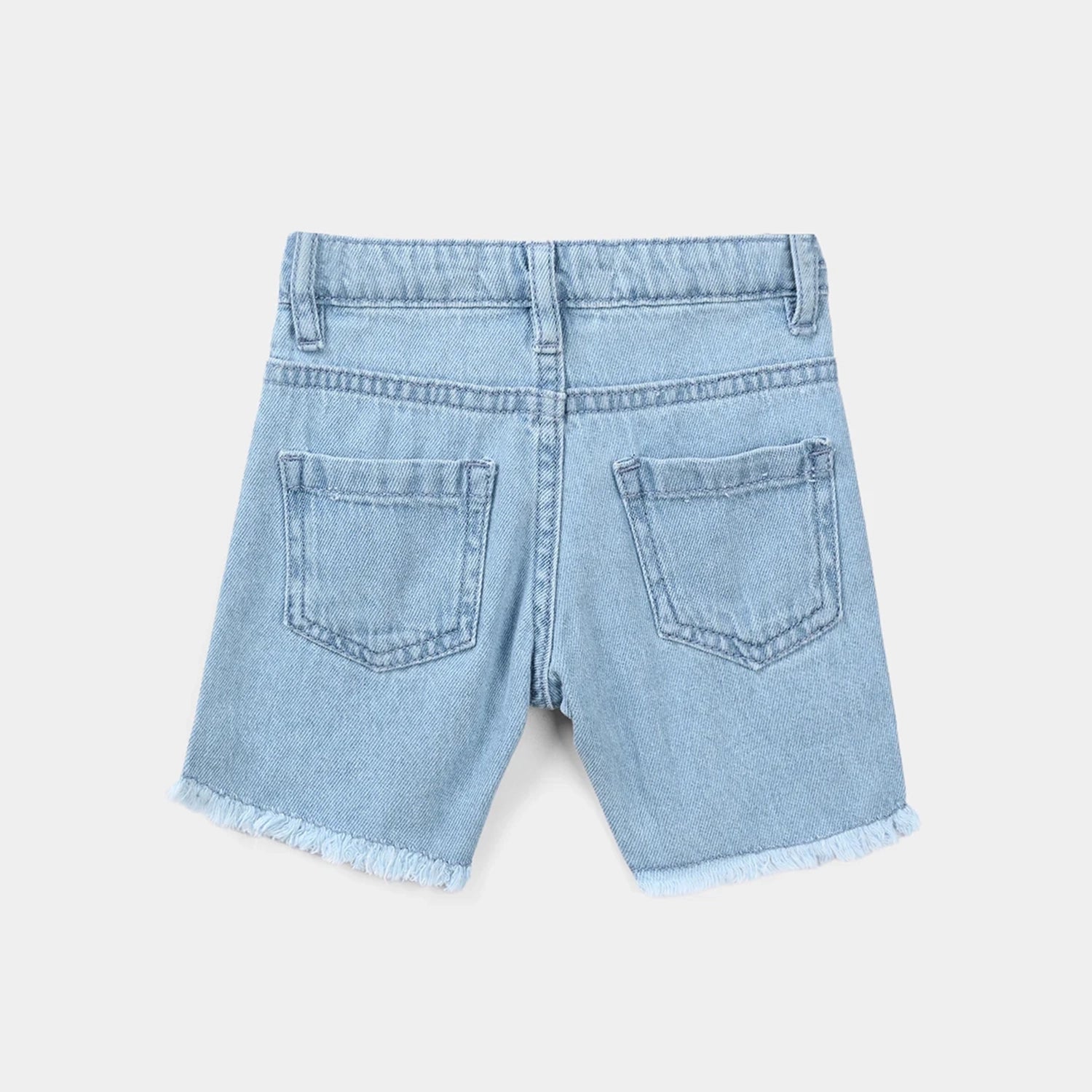 These blue denim shorts feature floral embroidery, pockets, and a ripped hem and can be paired with t-shirts or tops for a casual, stylish look.