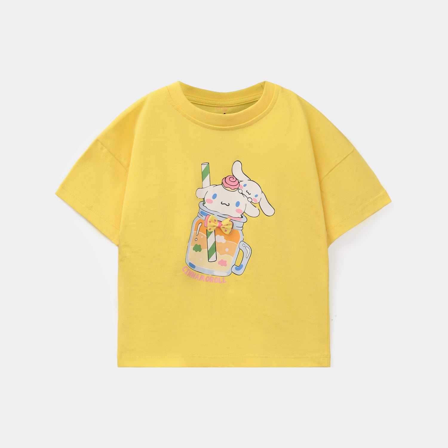 Infant girls’ yellow jersey T-shirt with a round neck and half sleeves, featuring a cute Cinnamoroll graphic, comfortable and easy to pair with any bottom all day long.