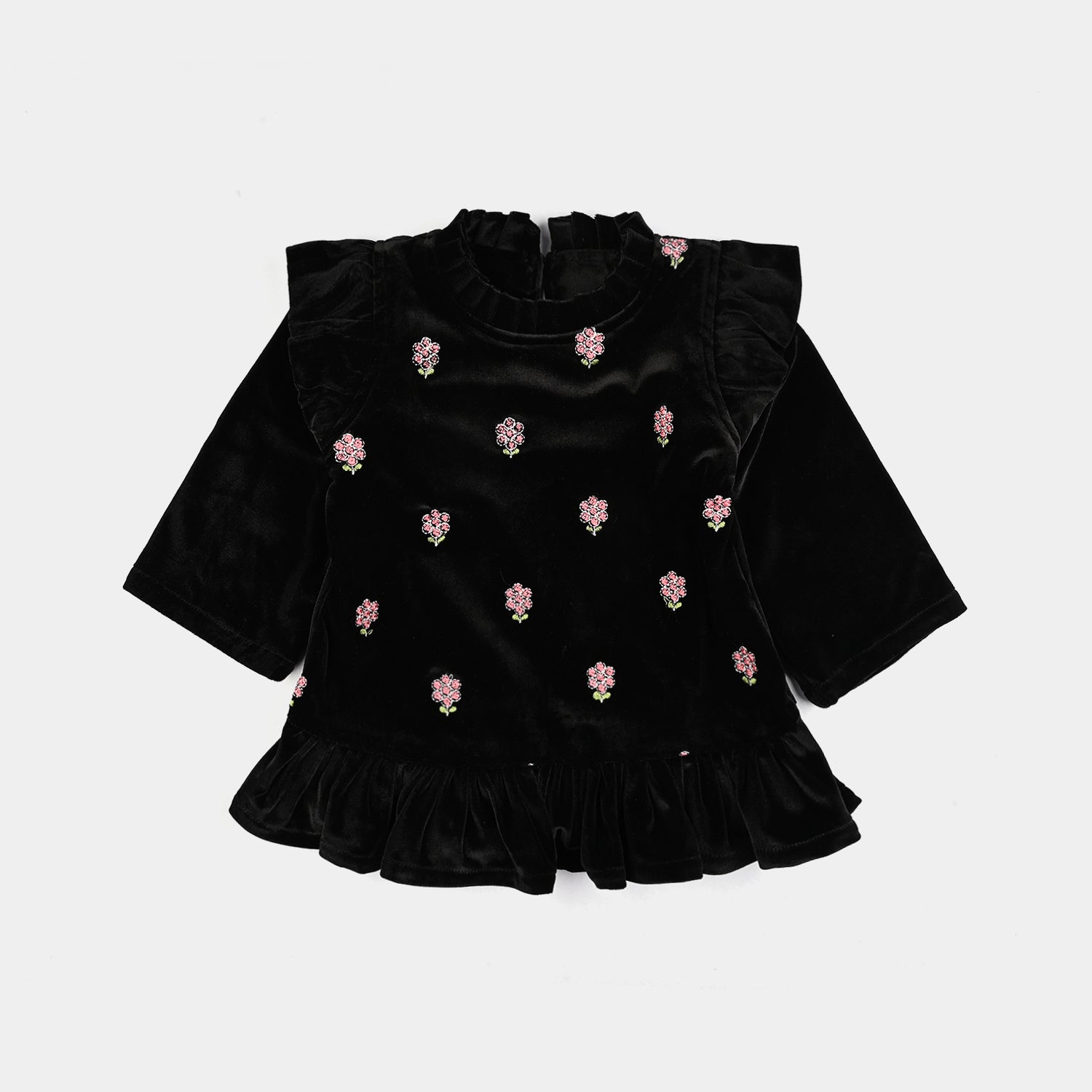 Let your little one shine in this beautifully embroidered Velvet top. Crafted from soft, breathable fabric, it keeps her cozy while allowing easy movement all day long. The frock-style silhouette with a round neckline adds a touch of sweetness, while delicate embroidery brings elegance to every detail.