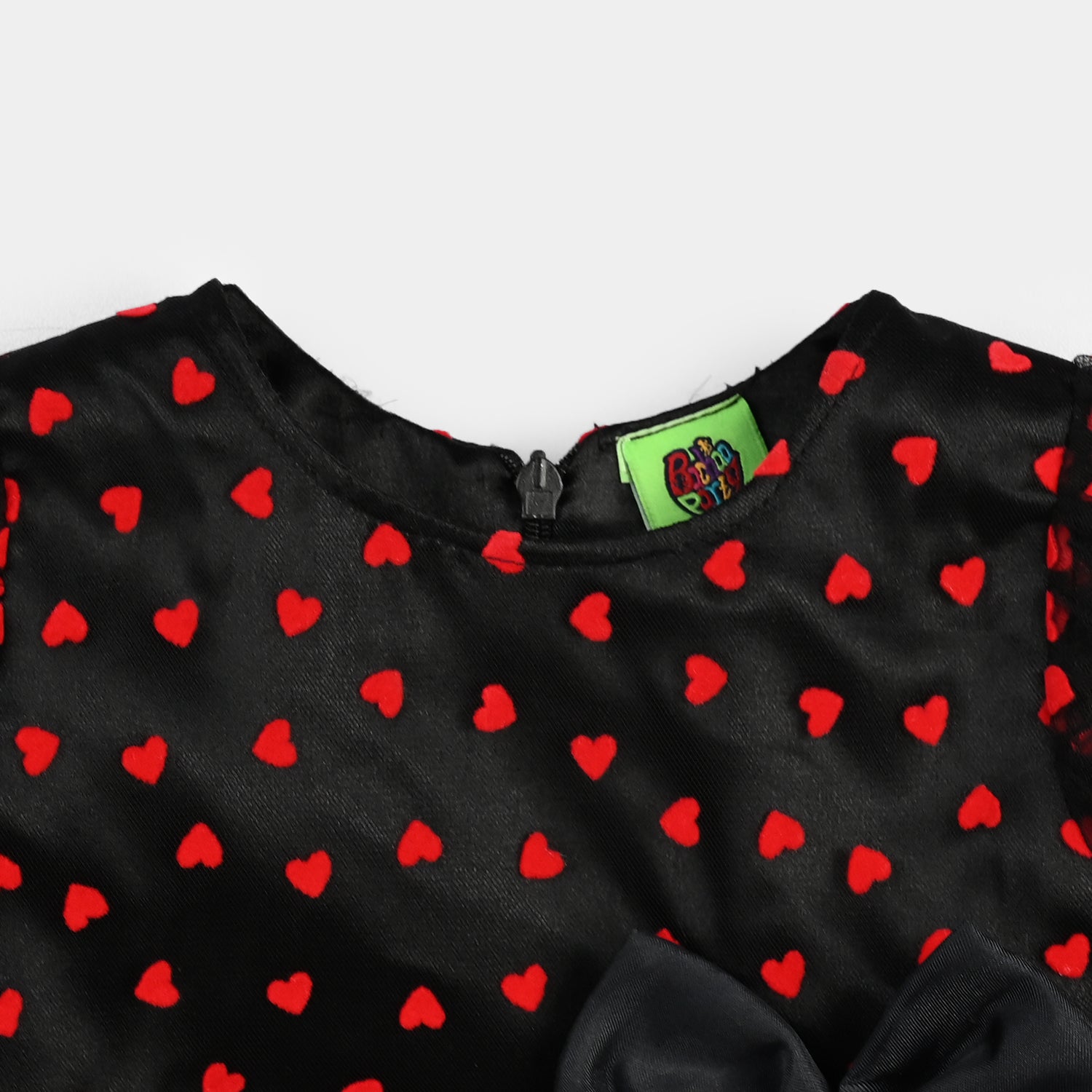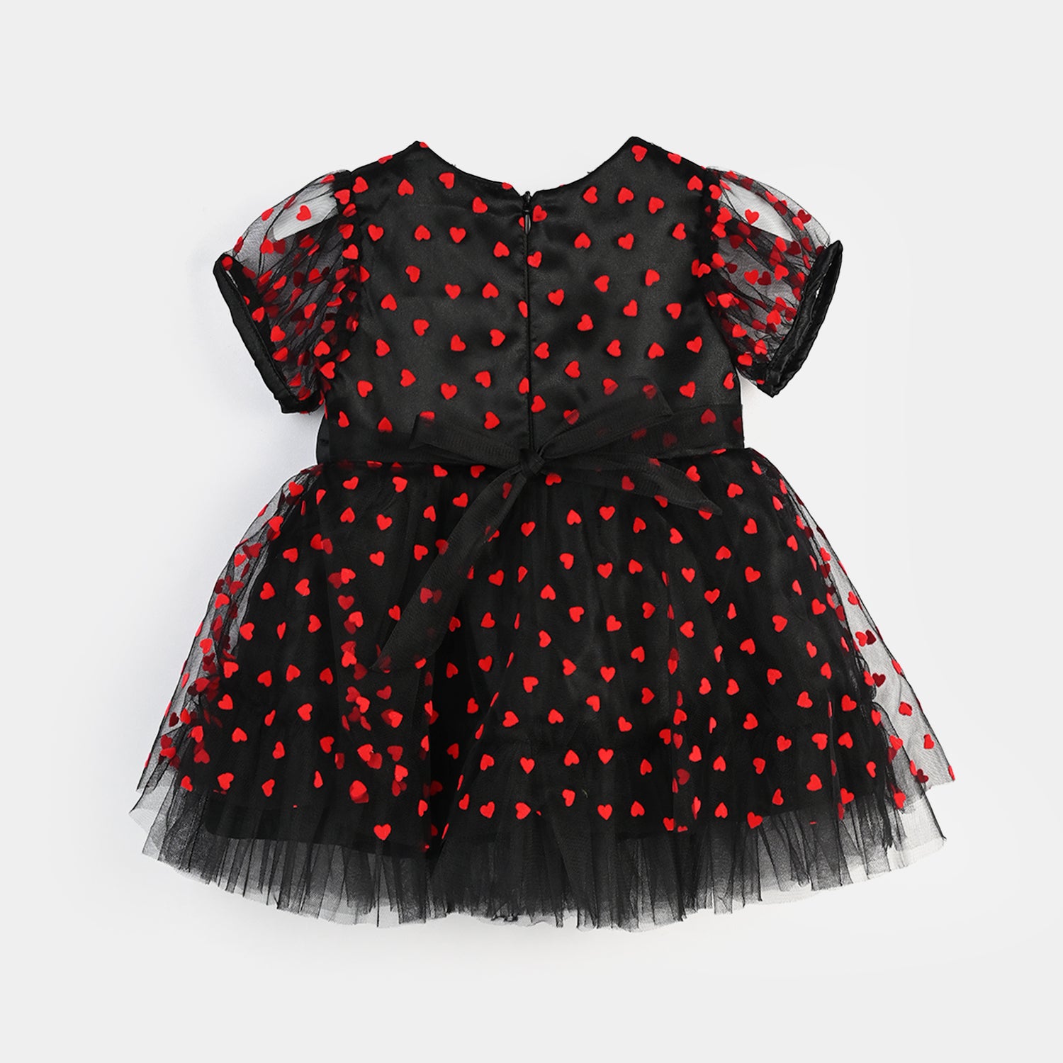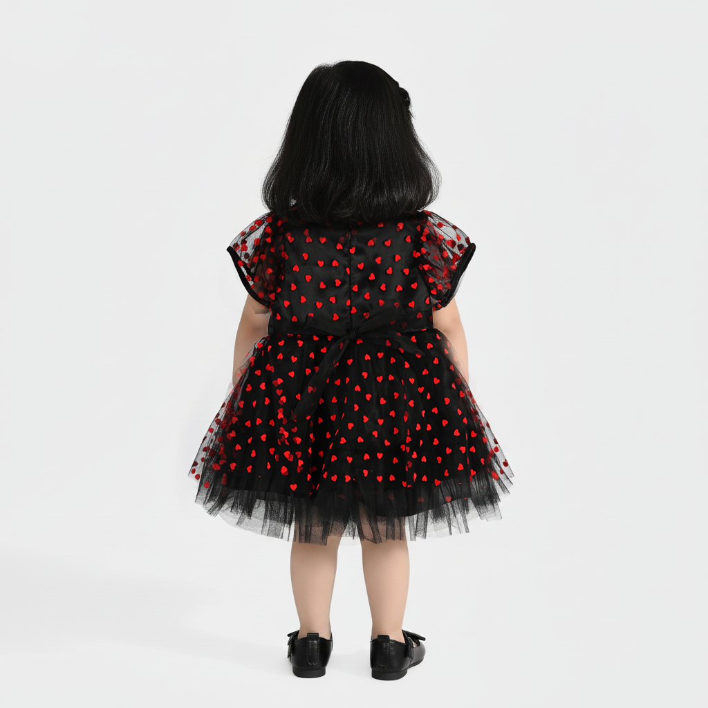 This black velvet frock is sprinkled with bold red printed hearts, creating a look that’s both playful and fancy. Perfect for celebrations and twirls that steal the spotlight.