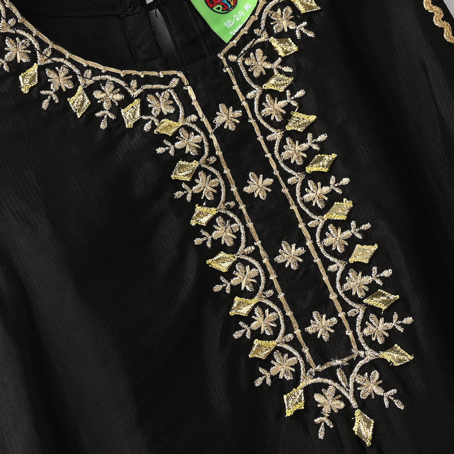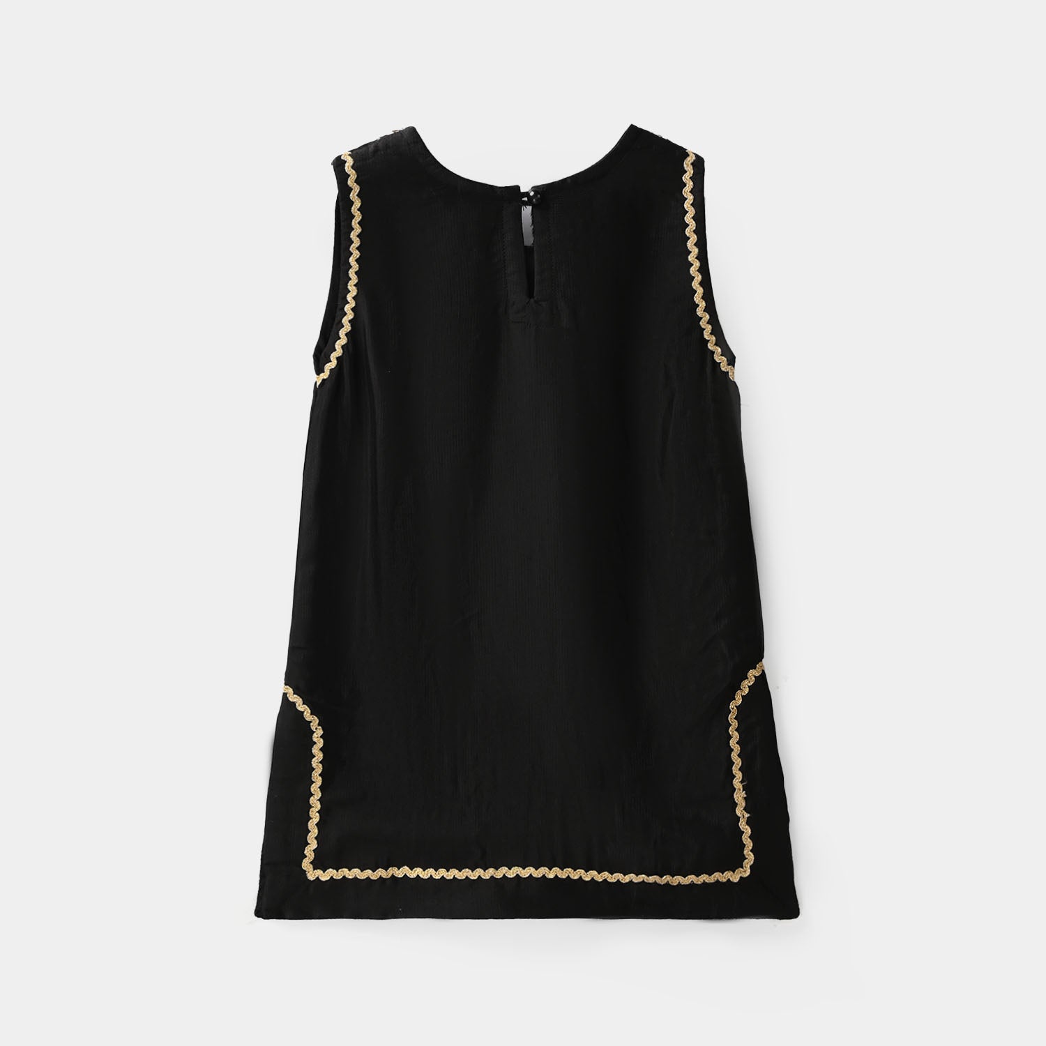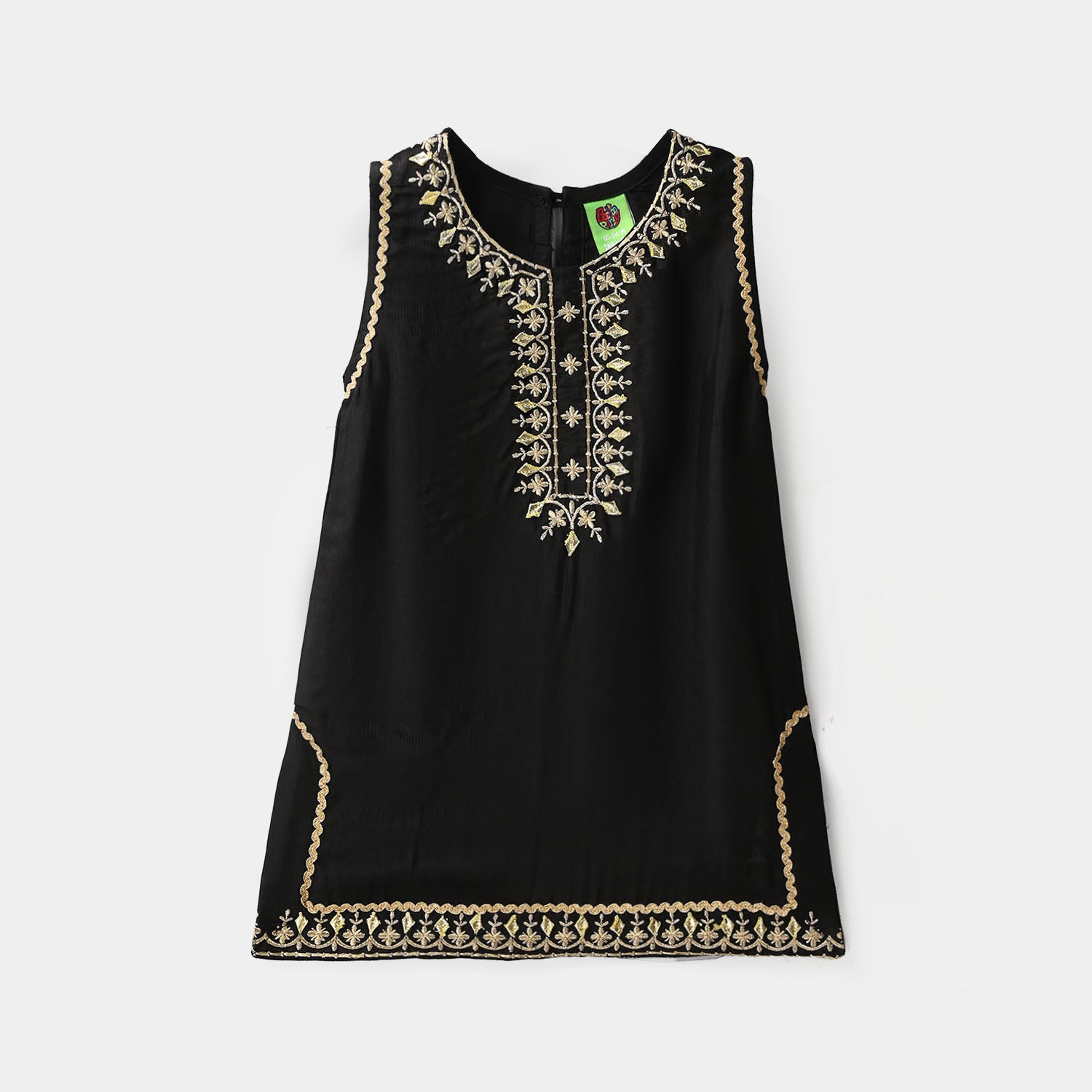 Infant girls 2-piece set in black featuring a sleeveless shirt with lace and embroidery on the front, paired with matching trousers with lace detailing for a coordinated look.