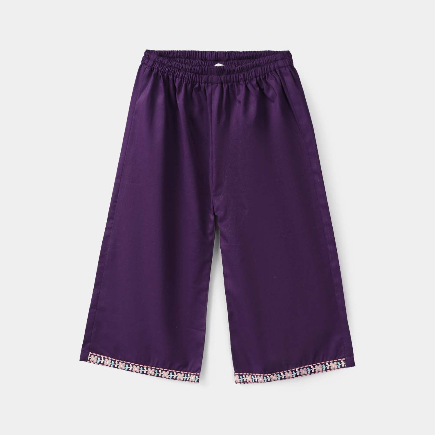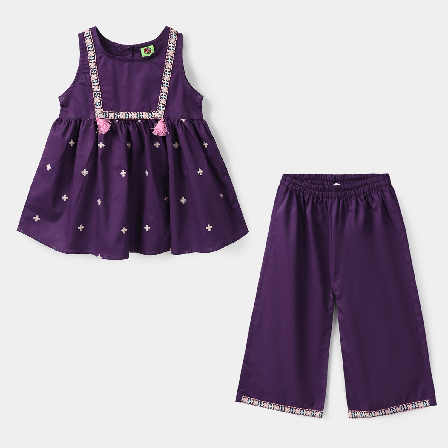 Infant girls’ cotton embroidered 2-piece set in purple featuring a sleeveless round-neck frock with loose matching pants. Soft and comfortable, perfect for everyday wear or festive occasions.