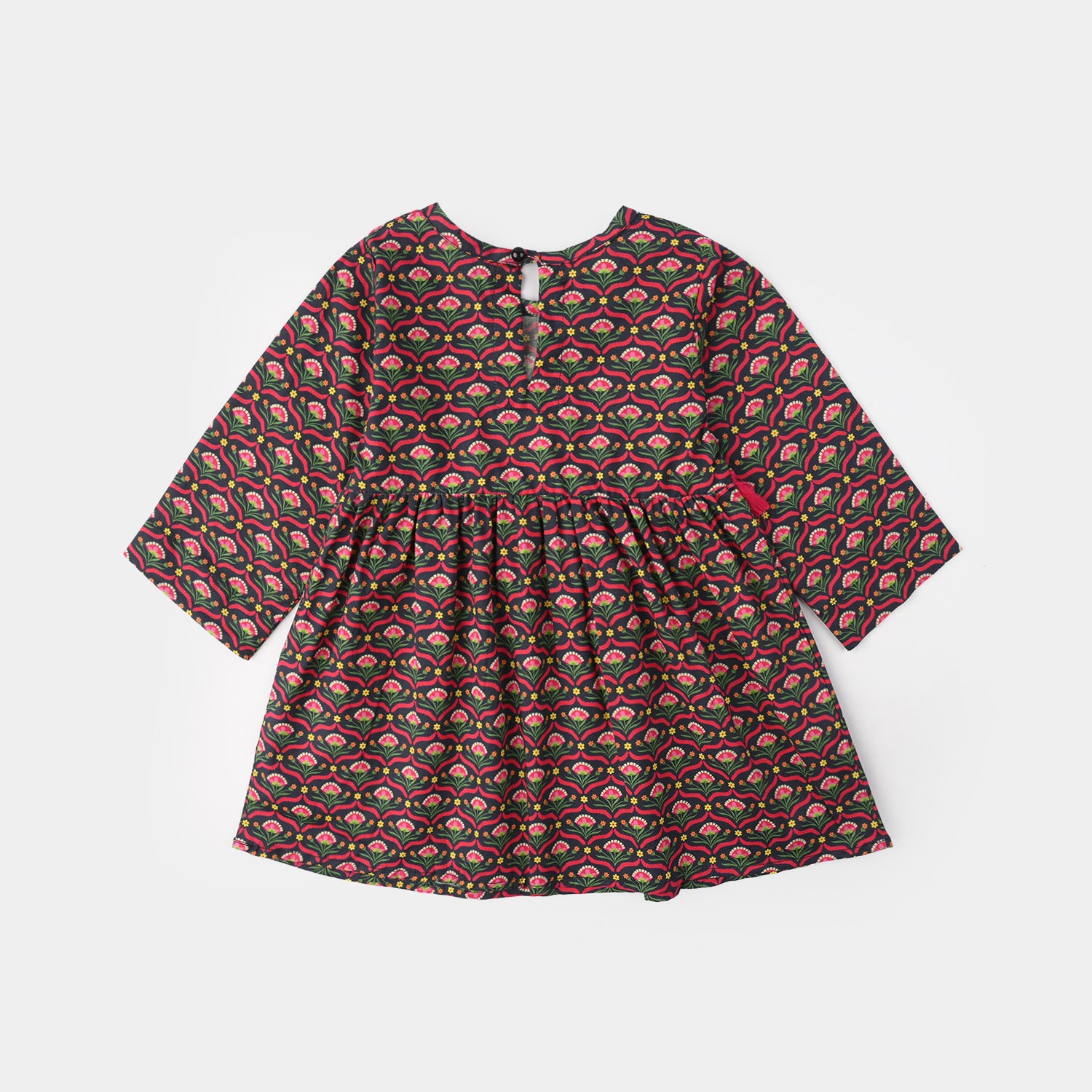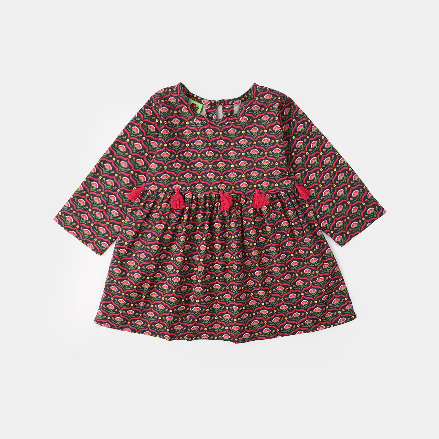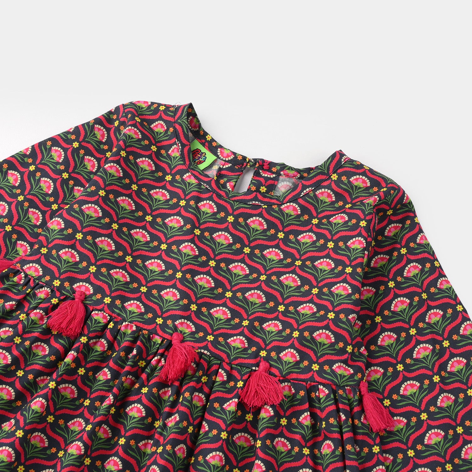 Girls' multi-colored cotton printed 2-piece suit features a round-neck frock with tassel detailing and a pleated style, paired with matching loose bottoms.
