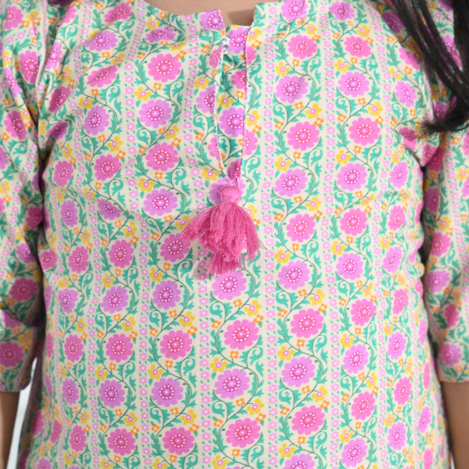Infant girls’ cotton printed 2-piece set featuring a straight-fit shirt with 3-quarter sleeves and matching straight-fit bottoms. Comfortable and perfect for everyday wear.