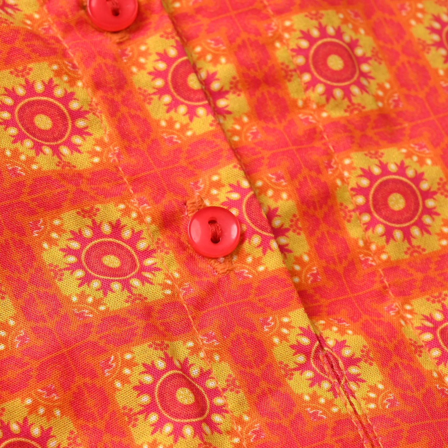 This orange top features a short sherwani collar, a frock-style design, full sleeves with an elastic finish, and pleated detailing. Can be paired with tights, trousers, or jeans for a stylish look.
