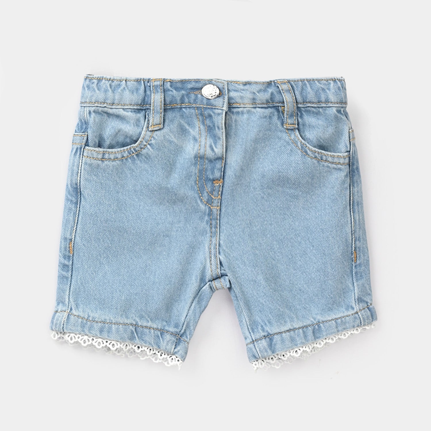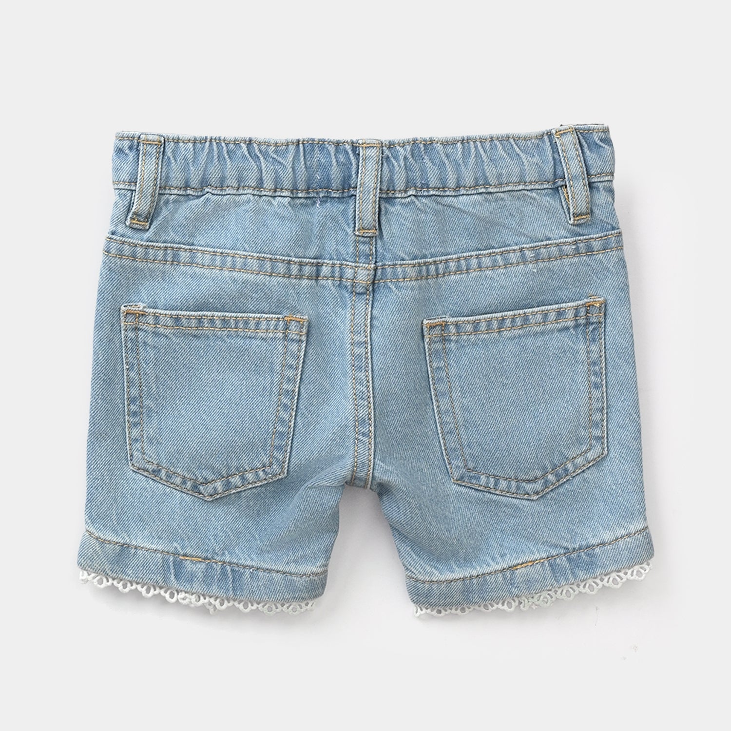 These blue denim shorts feature lace detailing and pockets, can be paired with t-shirts or tops for a casual, stylish look.
