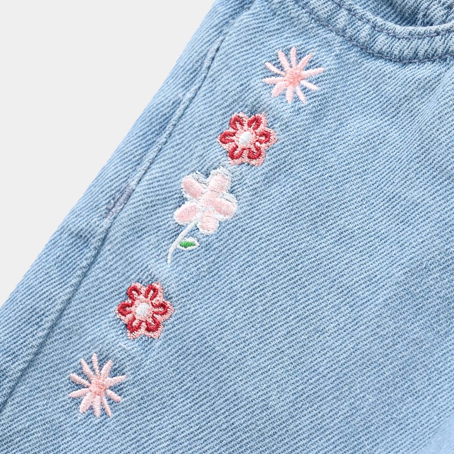 These blue denim shorts feature floral embroidery, pockets, and a ripped hem and can be paired with t-shirts or tops for a casual, stylish look.