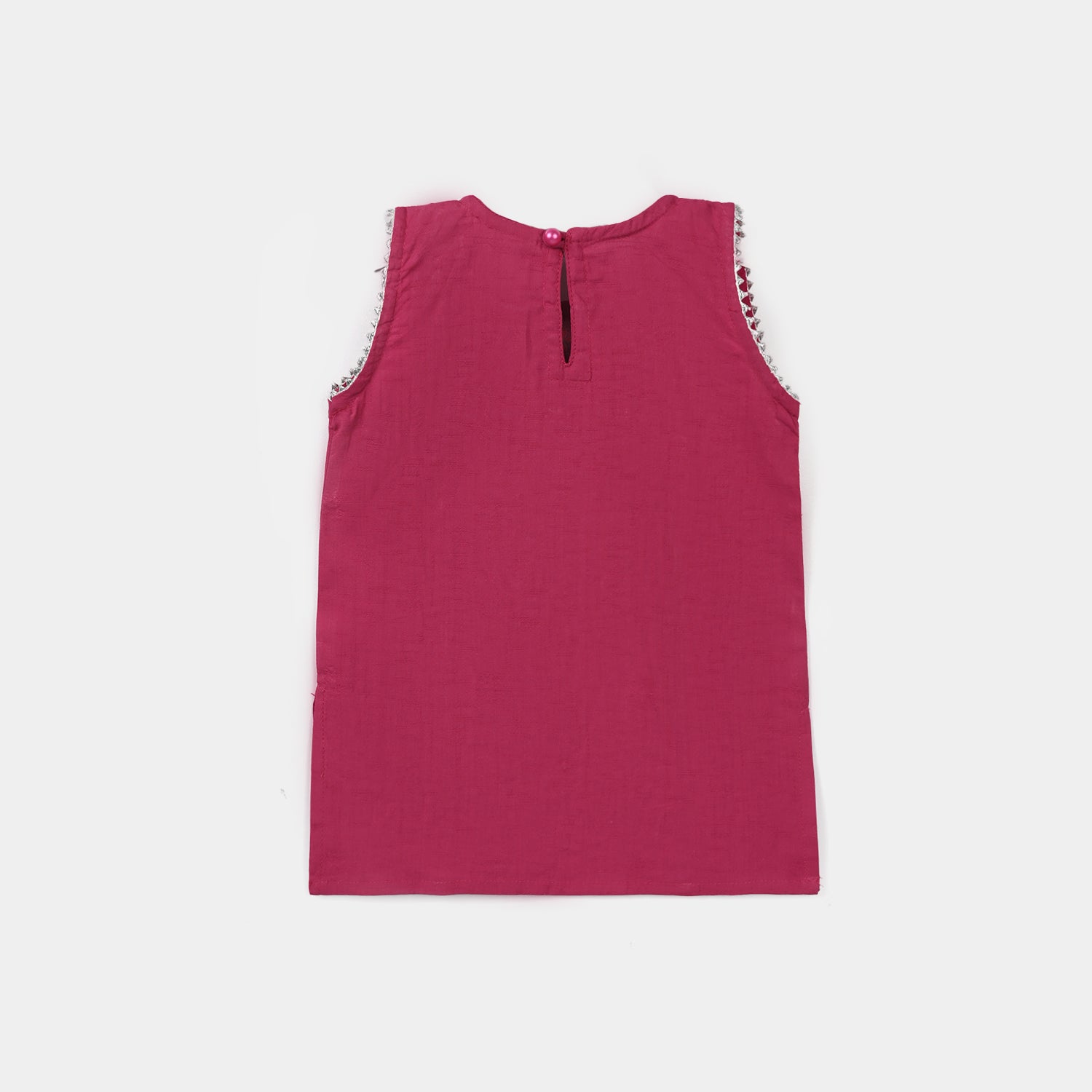 Girls' sleeveless kurti in magenta features a round neck, straight fit, jacquard fabric, and lace detailing for a stylish everyday look.