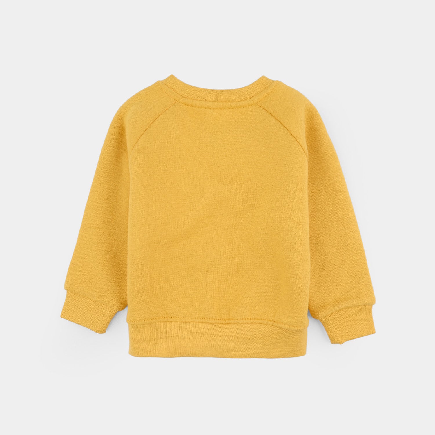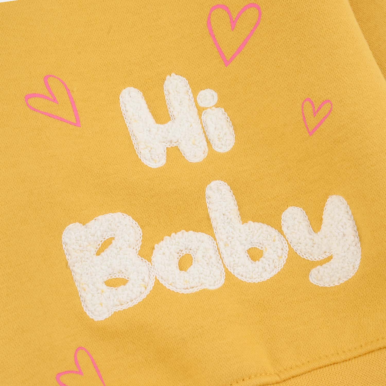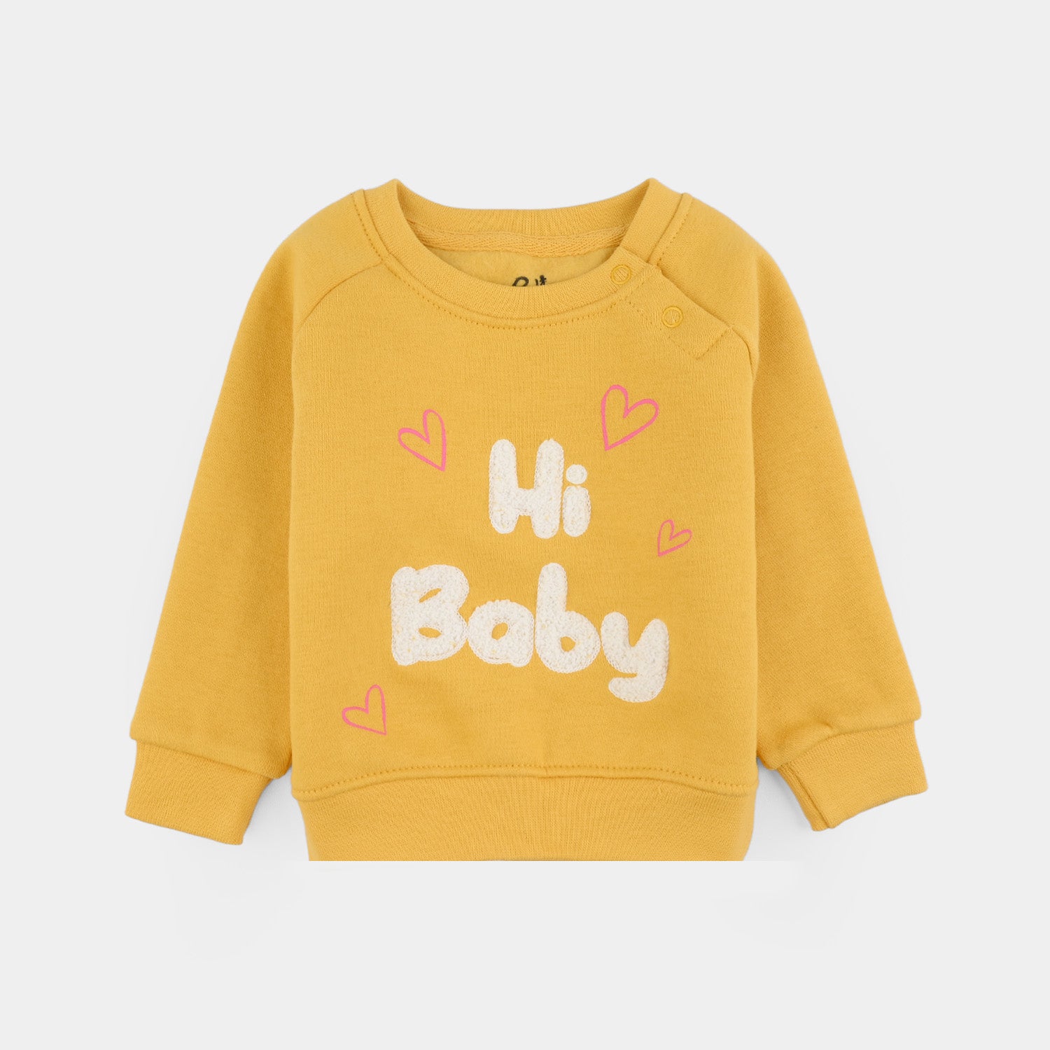 Fleece 2 Piece Suit in Yellow featuring a “Hi Baby” embroidery with heart print on the front, a classic round neck, and full sleeves finished with a hem for a perfect fit. Cozy, soft, and ideal for everyday wear.