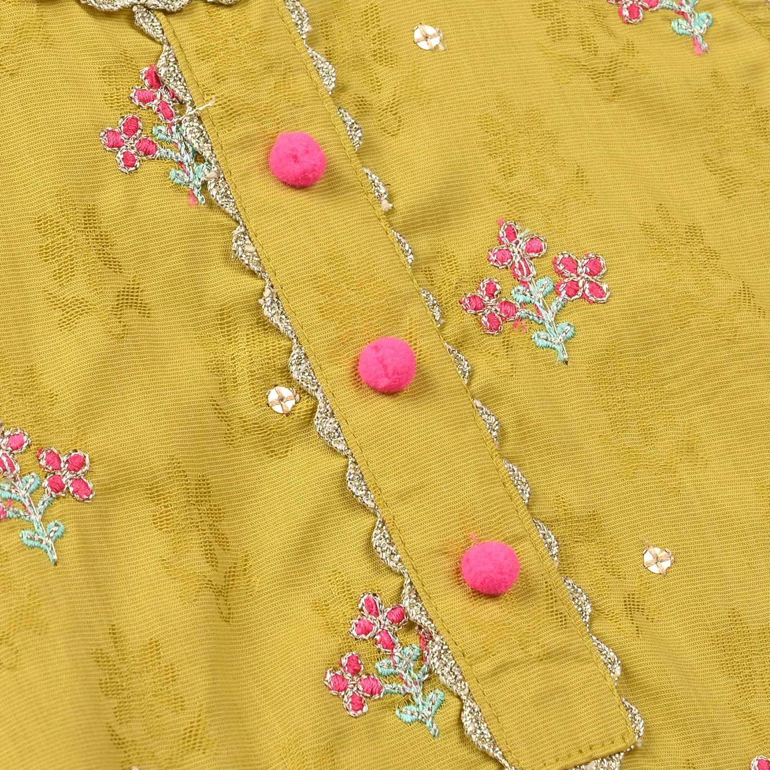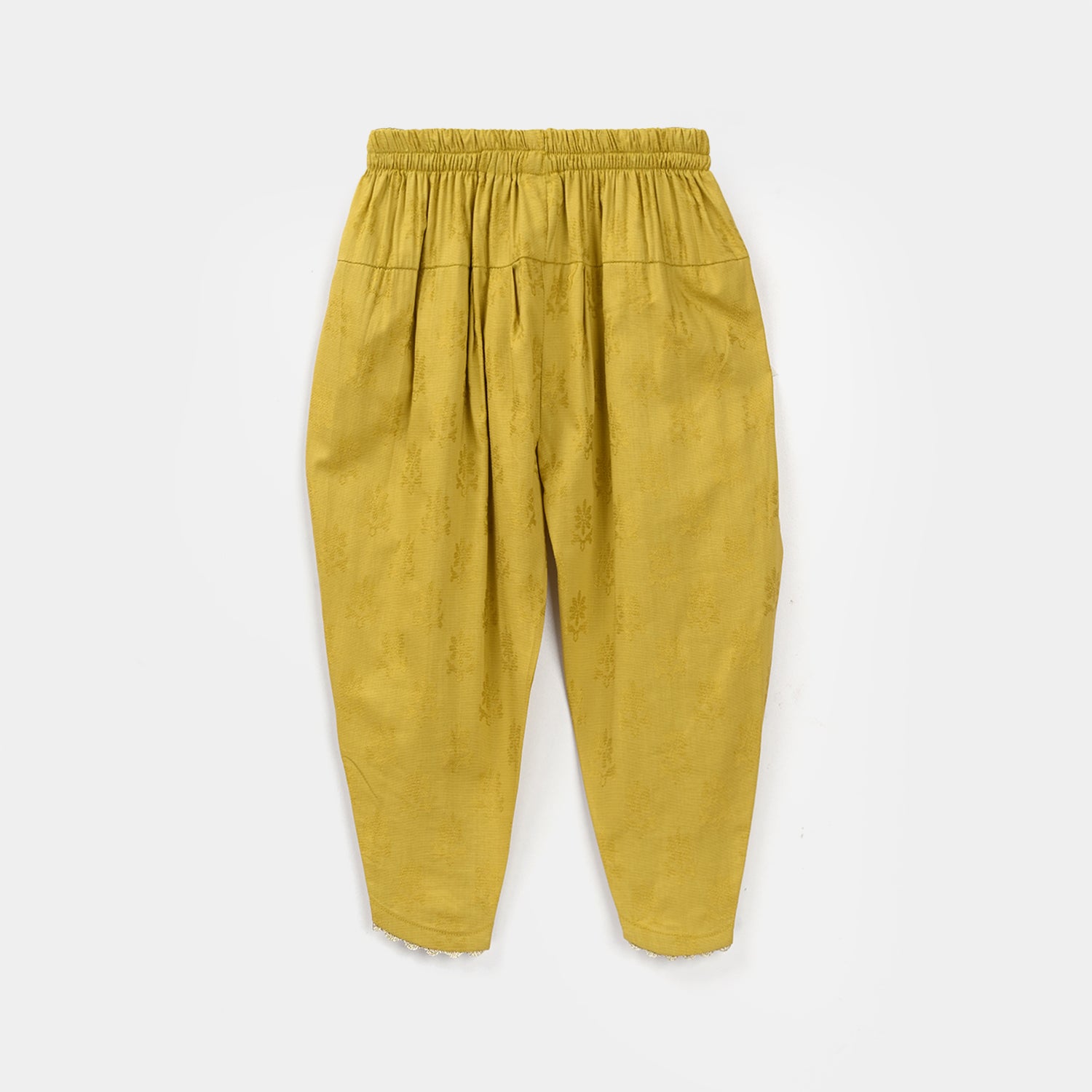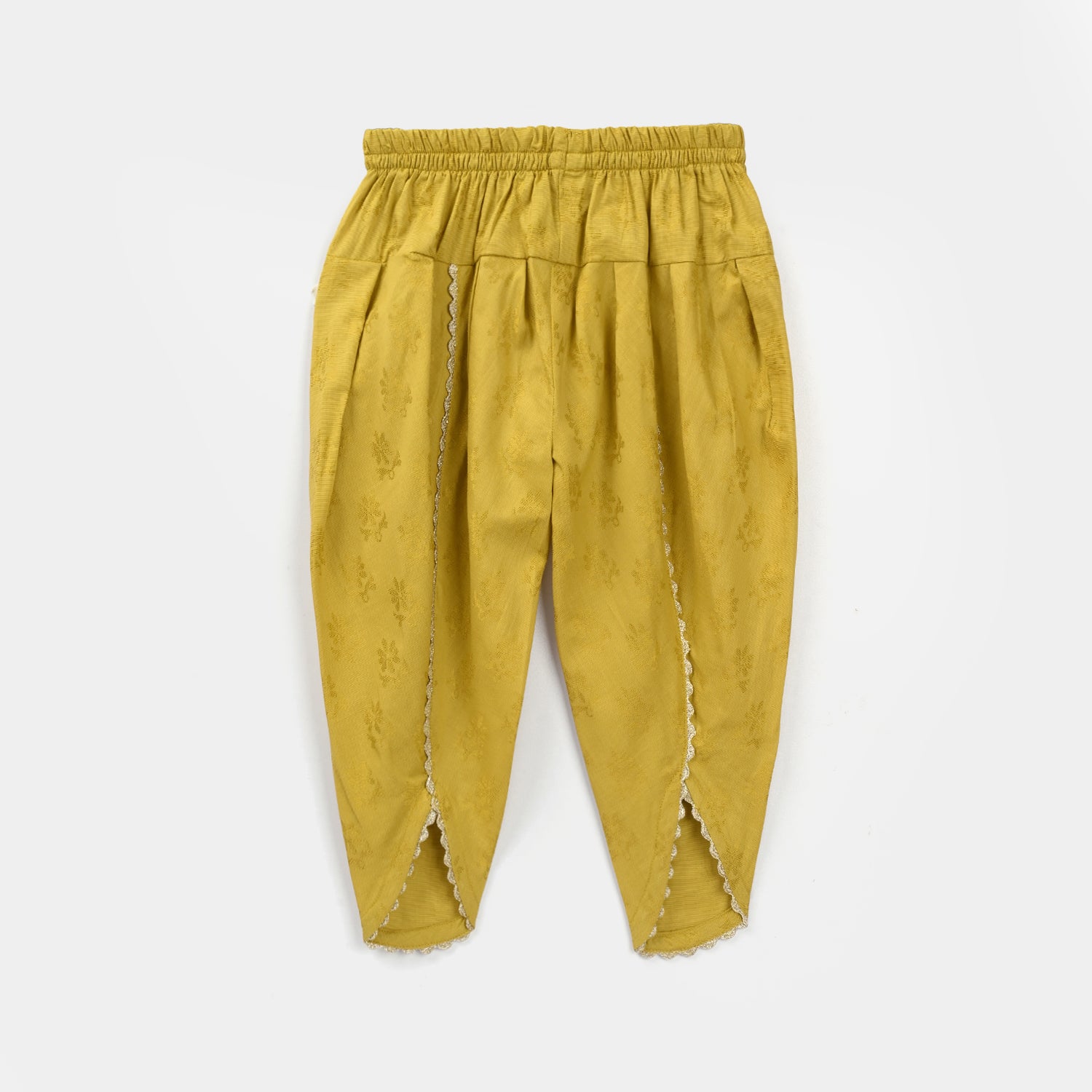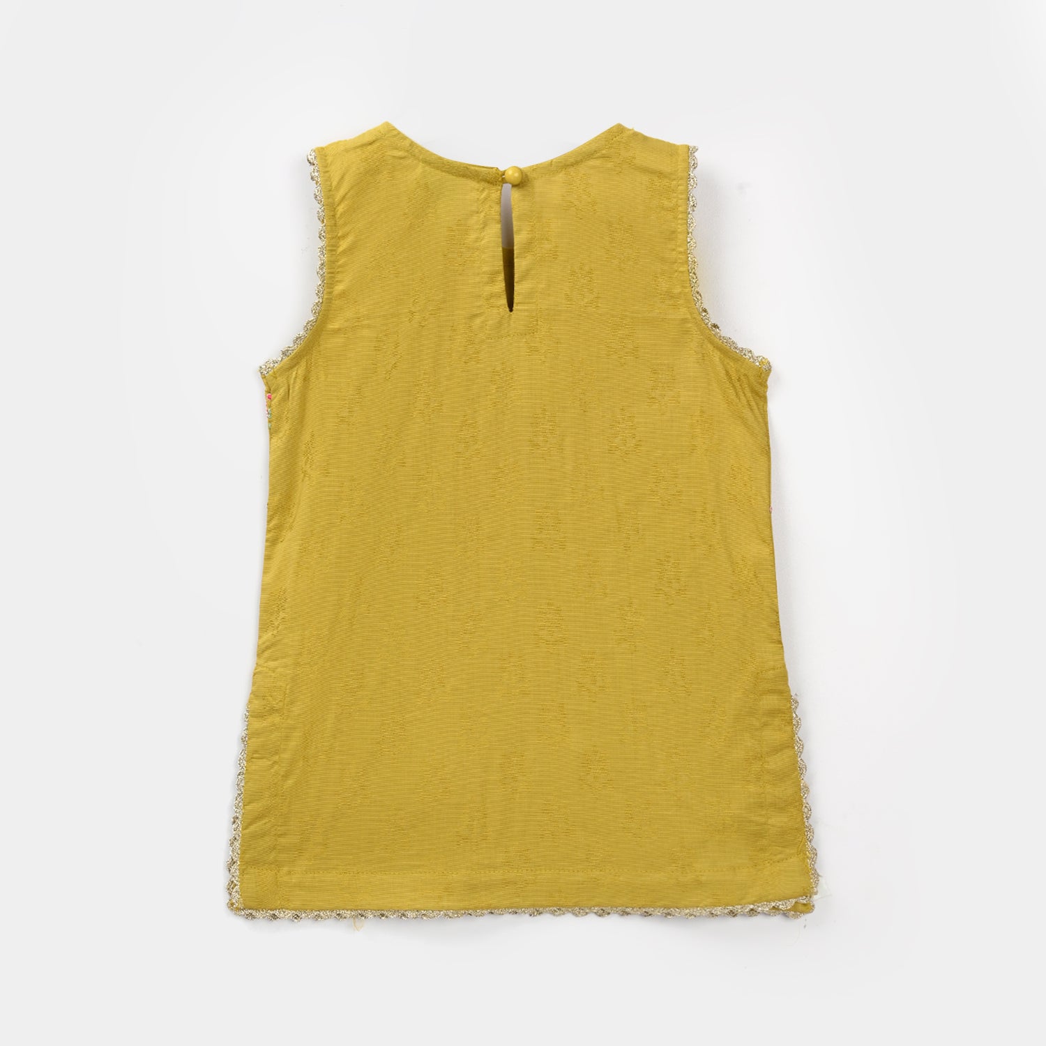 This girls green 2-piece set features a round neck with front buttons and lace embellishment, a sleeveless top, and matching tulip trousers finished with lace detailing.