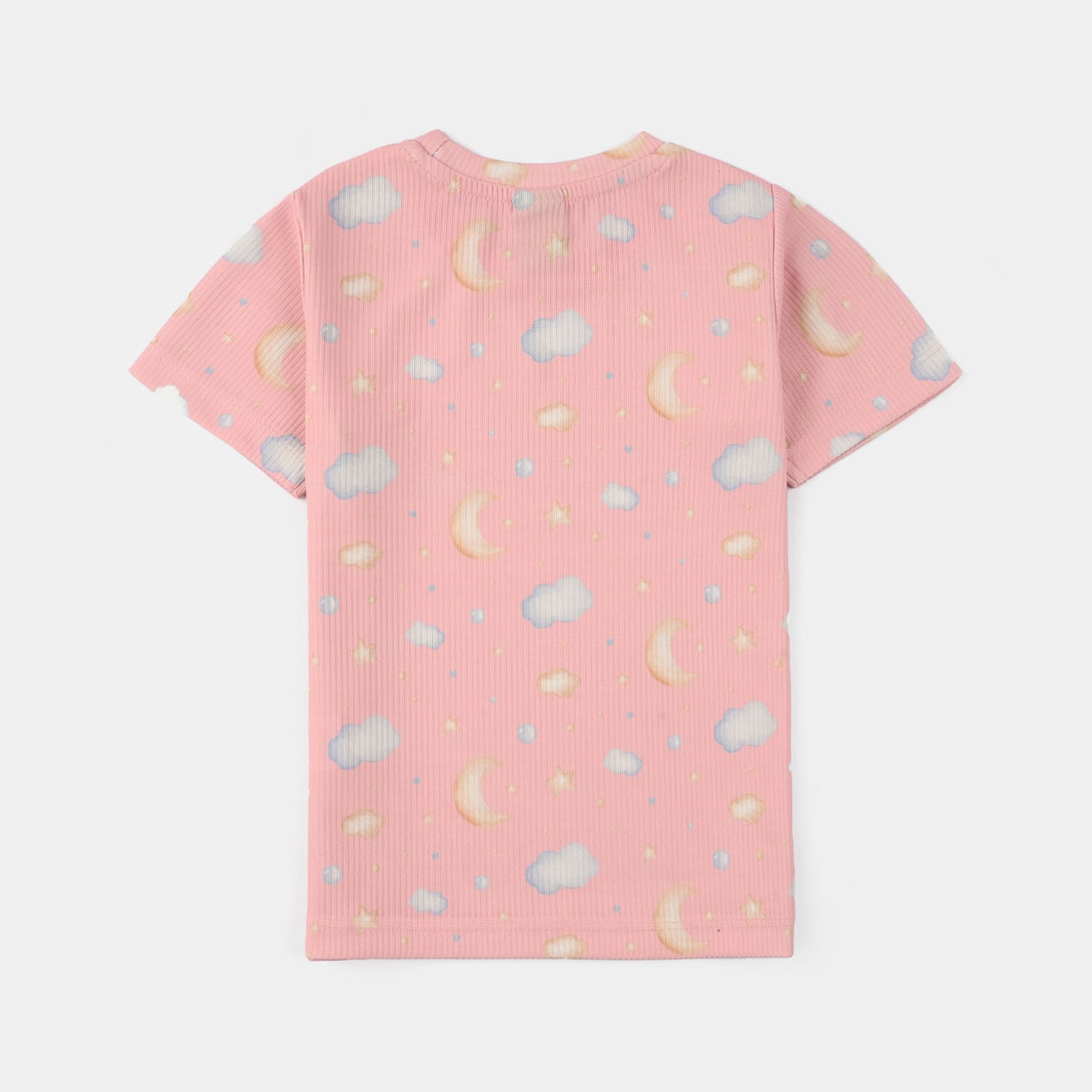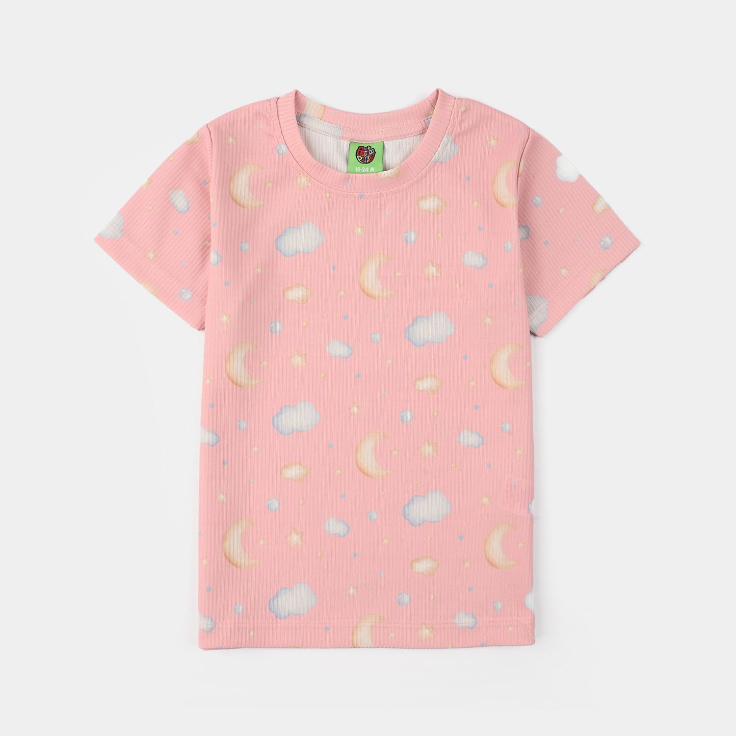 Infant girls’ jersey/terry night suit in pink featuring a round neck, half sleeves, and star & moon print with matching bottoms. Soft and comfy for a cozy night’s sleep.