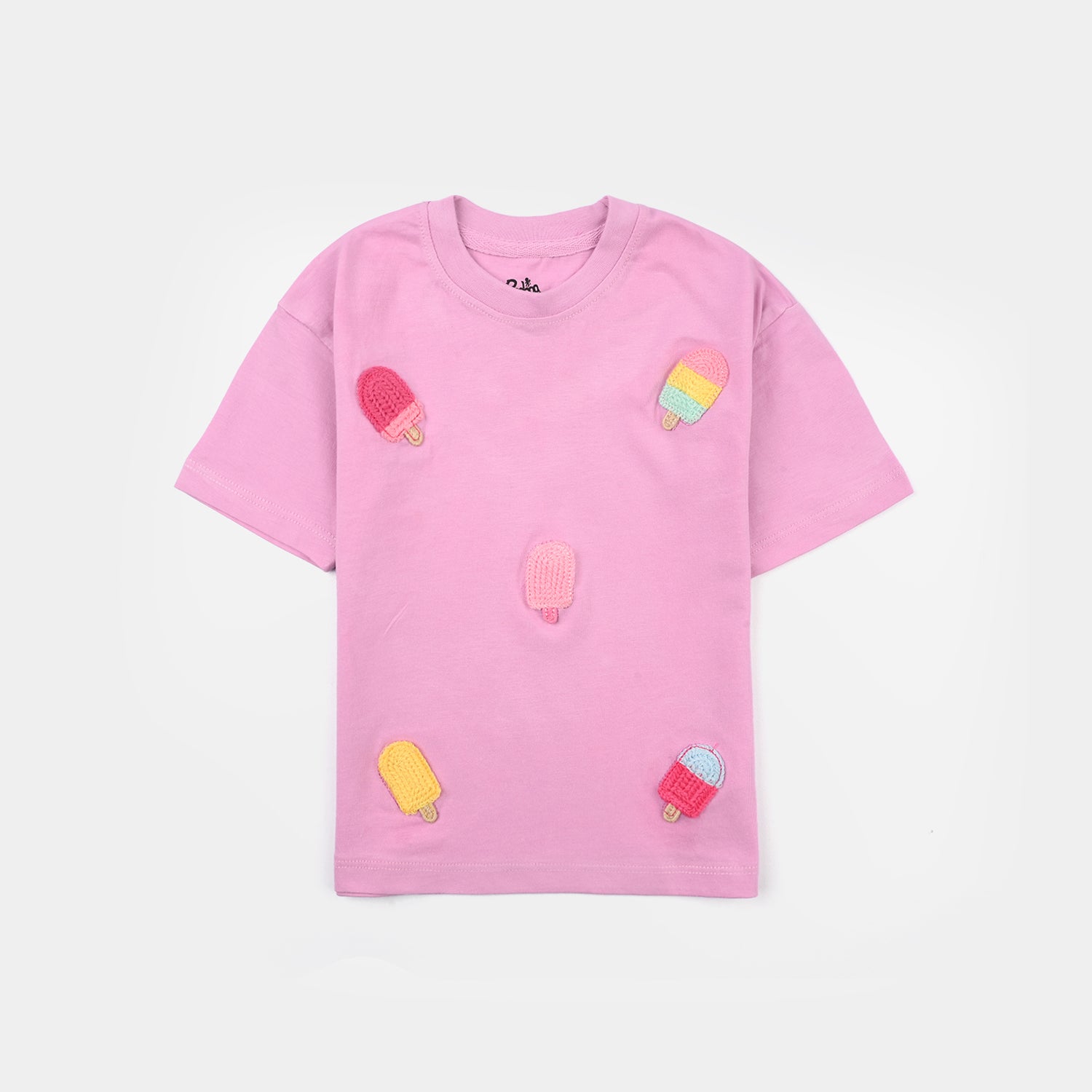 Infant girls jersey/terry half-sleeve T-shirt in pink features a playful ice cream design. Comfortable and breathable, it’s perfect for everyday wear.