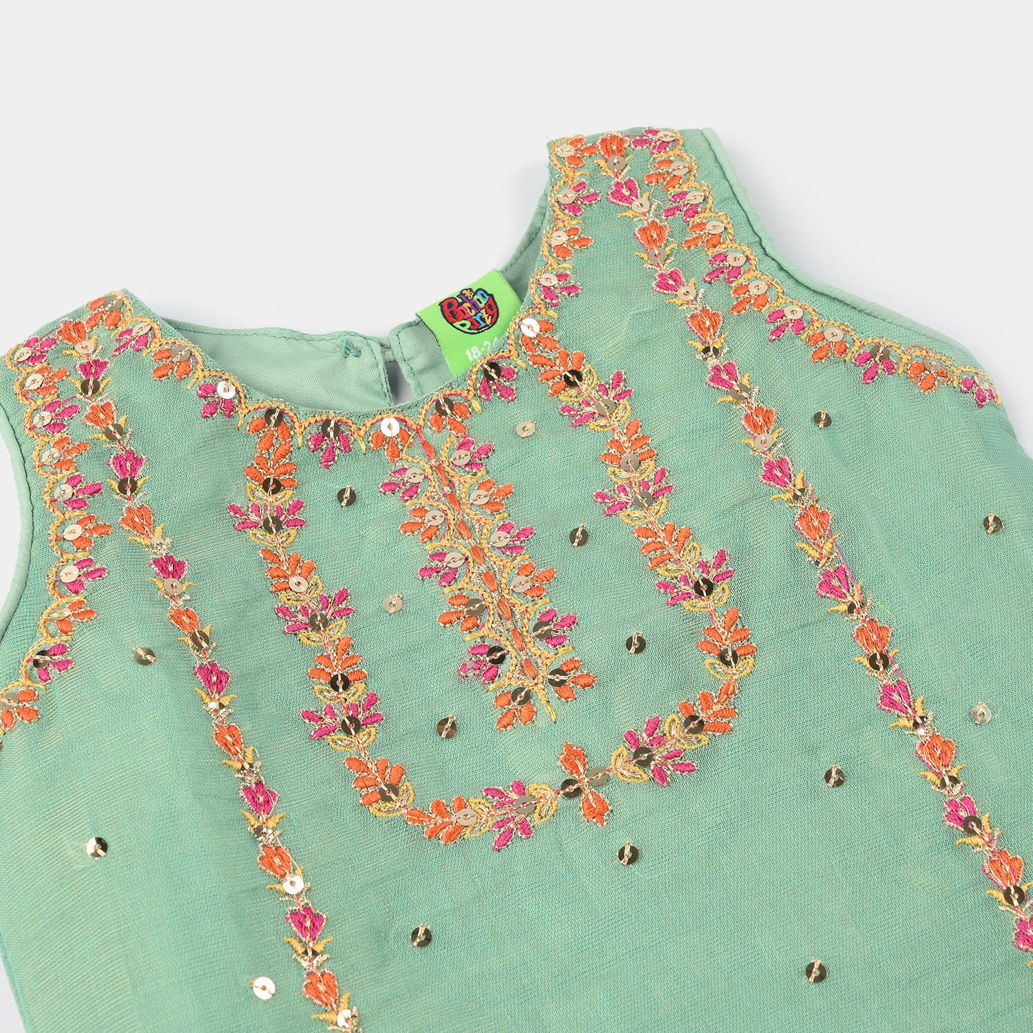 This mint green net 2-piece suit features a sleeveless embroidered round-neck shirt with matching bottoms. Soft and comfortable, it’s perfect for festive occasions or special outings for infant girls.