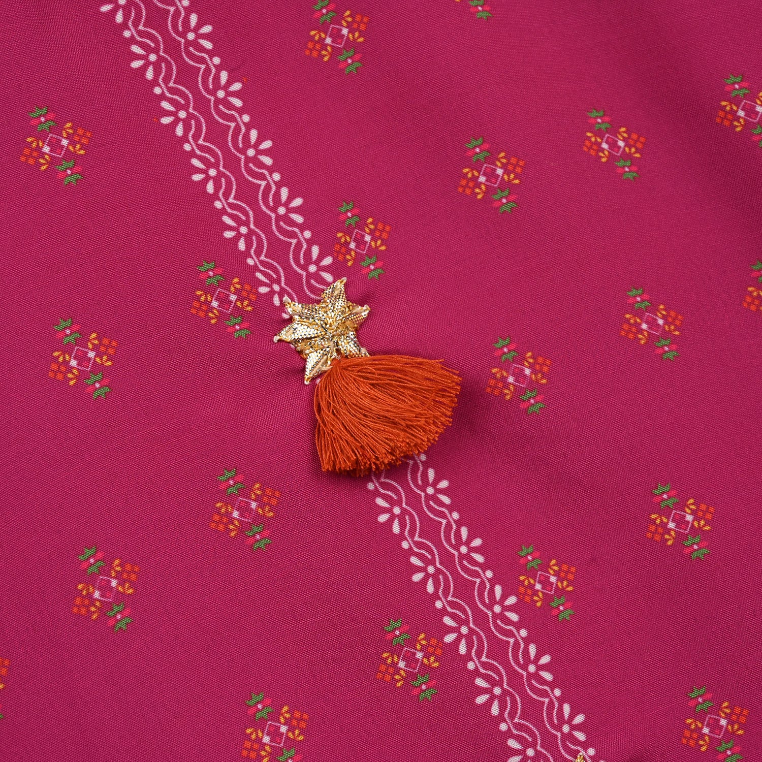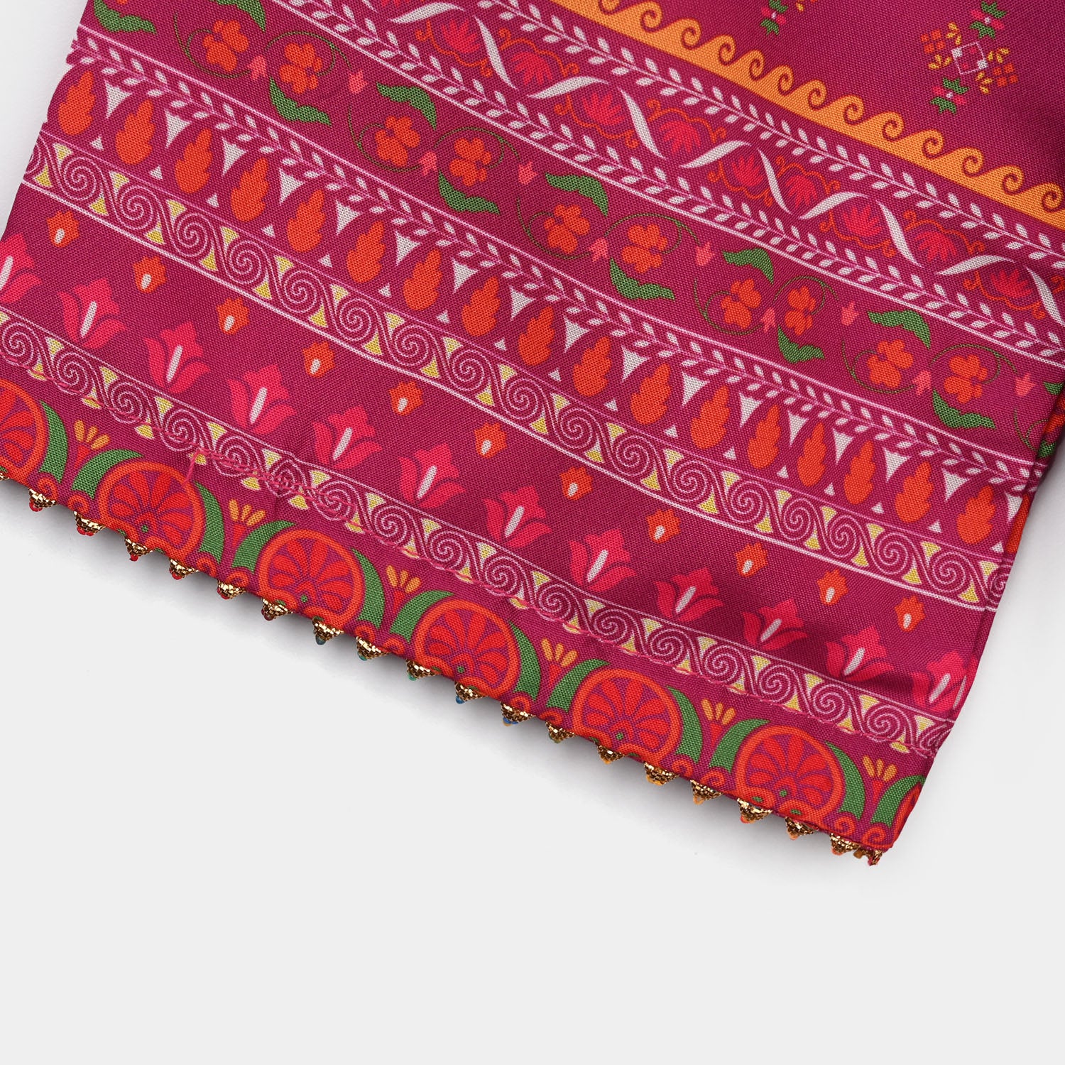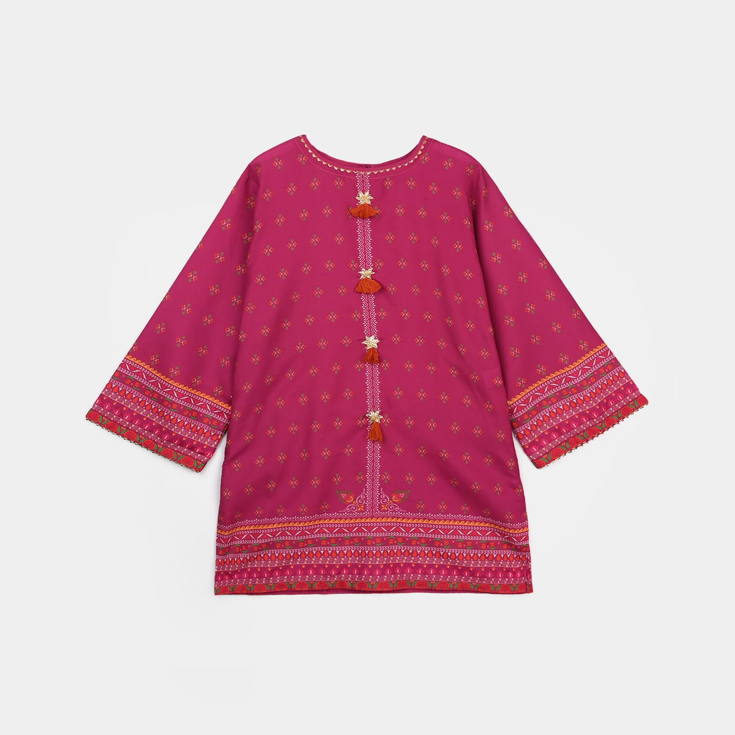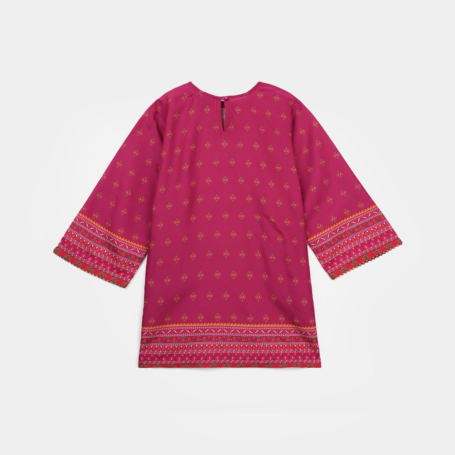 This magenta girls’ 2-piece poly mesh printed set features a gota button-embellished neckline, full sleeves, a straight-fit shirt, and matching loose wide-leg trousers for a stylish and comfortable look.