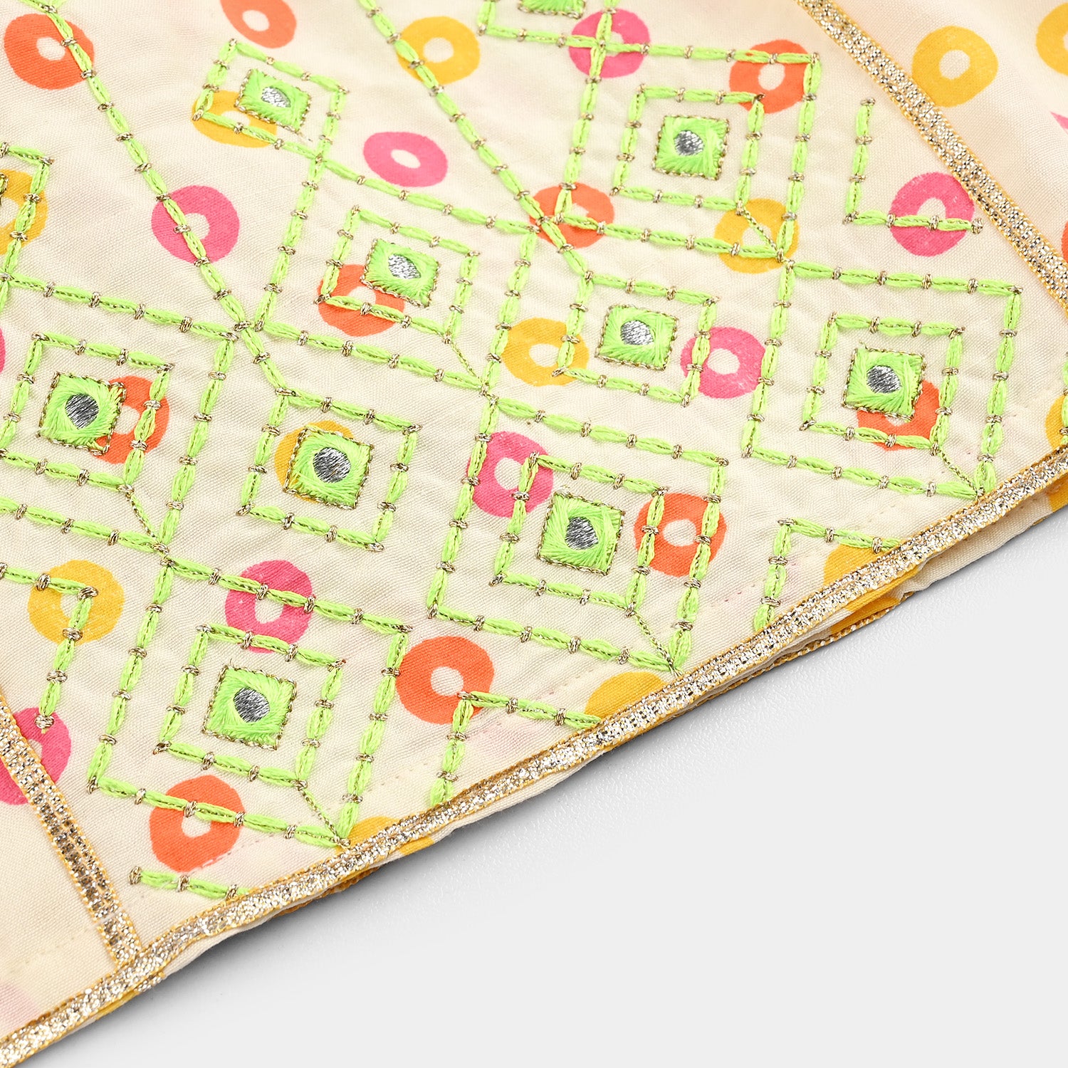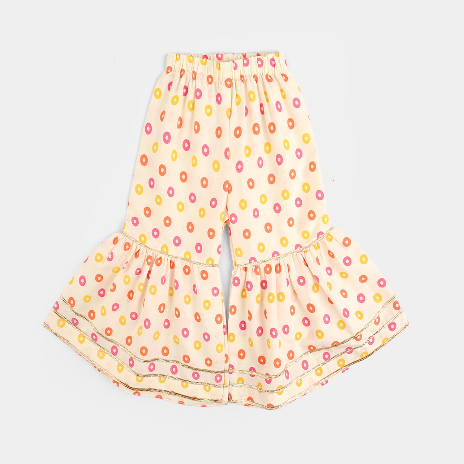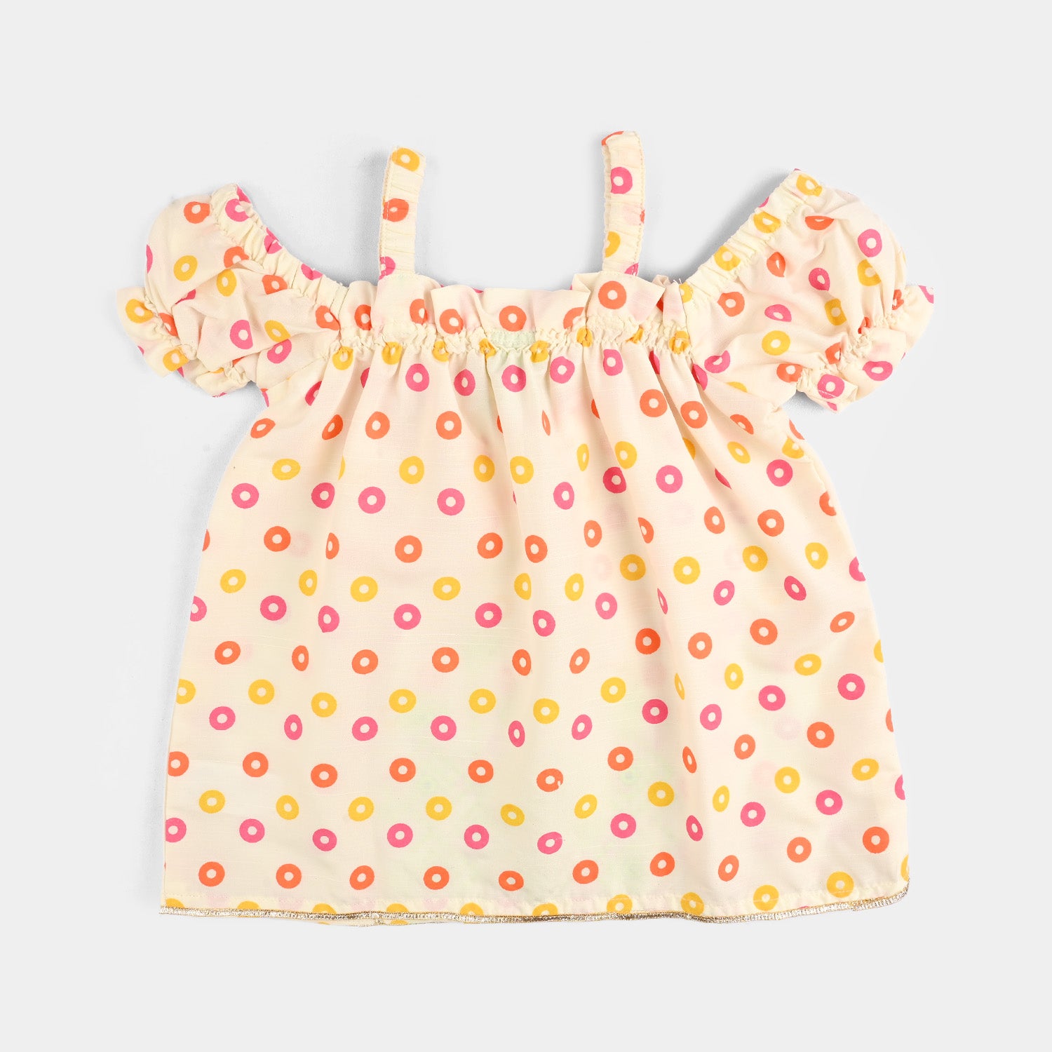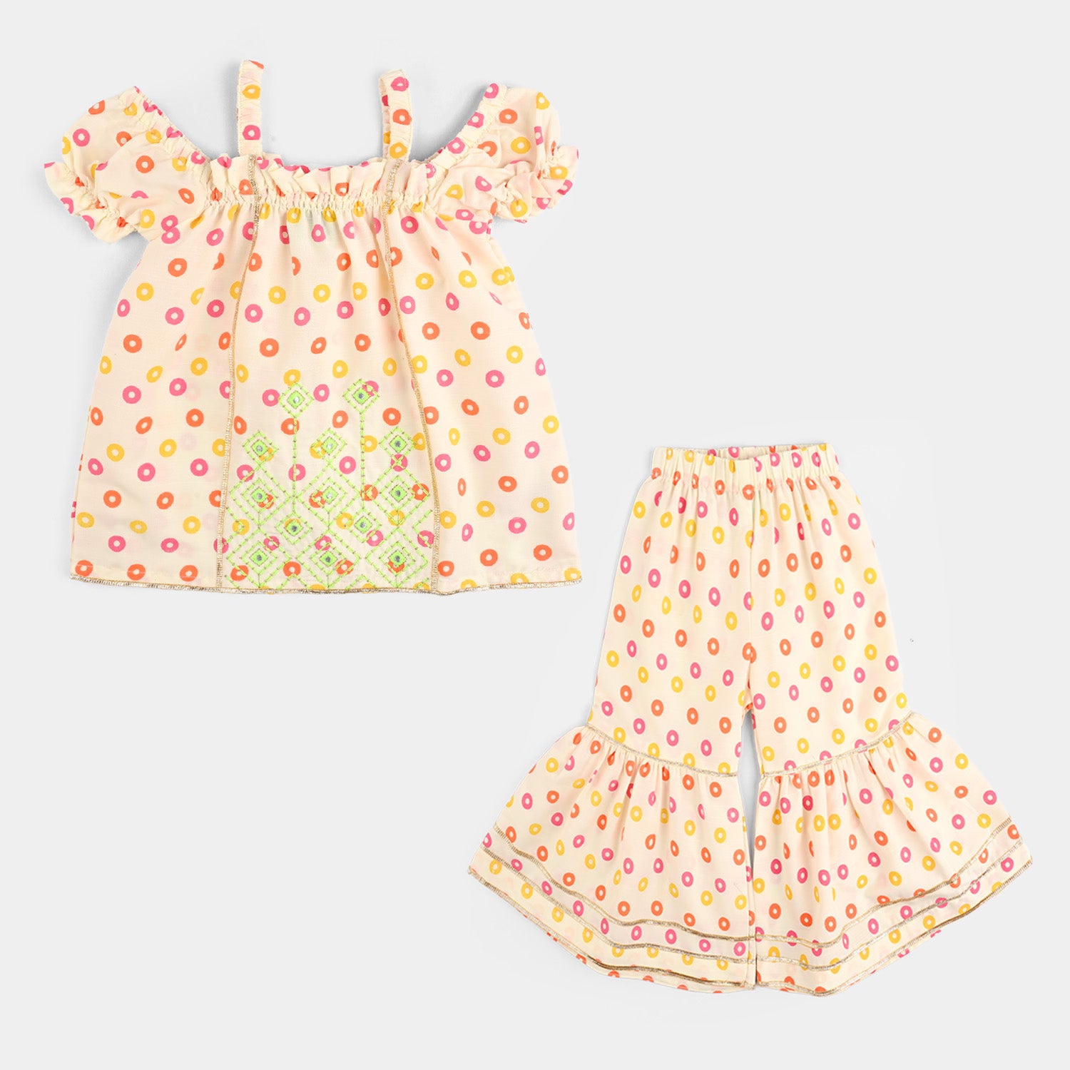This cream printed infant 2-piece features an off-shoulder frock-style top with front embroidery and lace embellishment, paired with a matching gharara finished with delicate lace detailing.