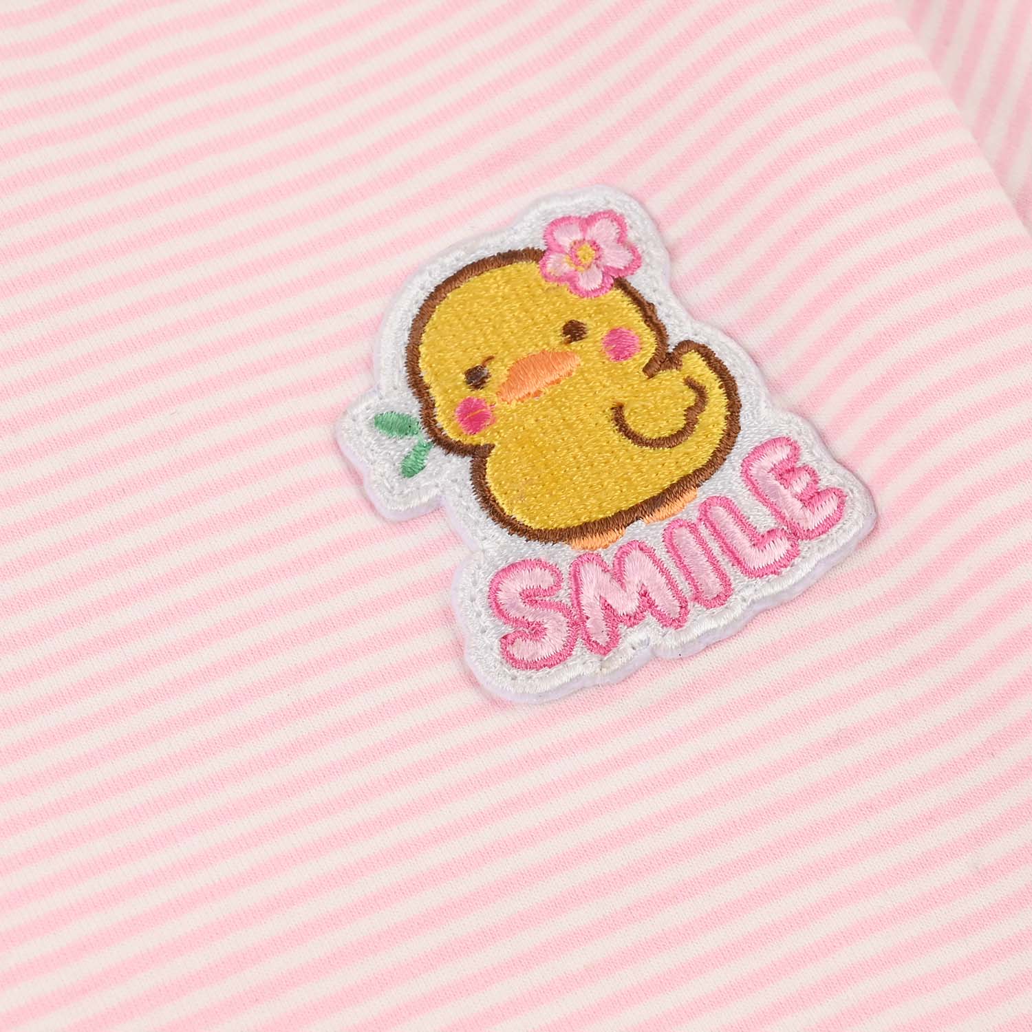 Infant girls’ T-shirt in pink/white features a striped pattern with a round neck, half sleeves, and a duck embroidery on the front, perfect for everyday comfort and style.