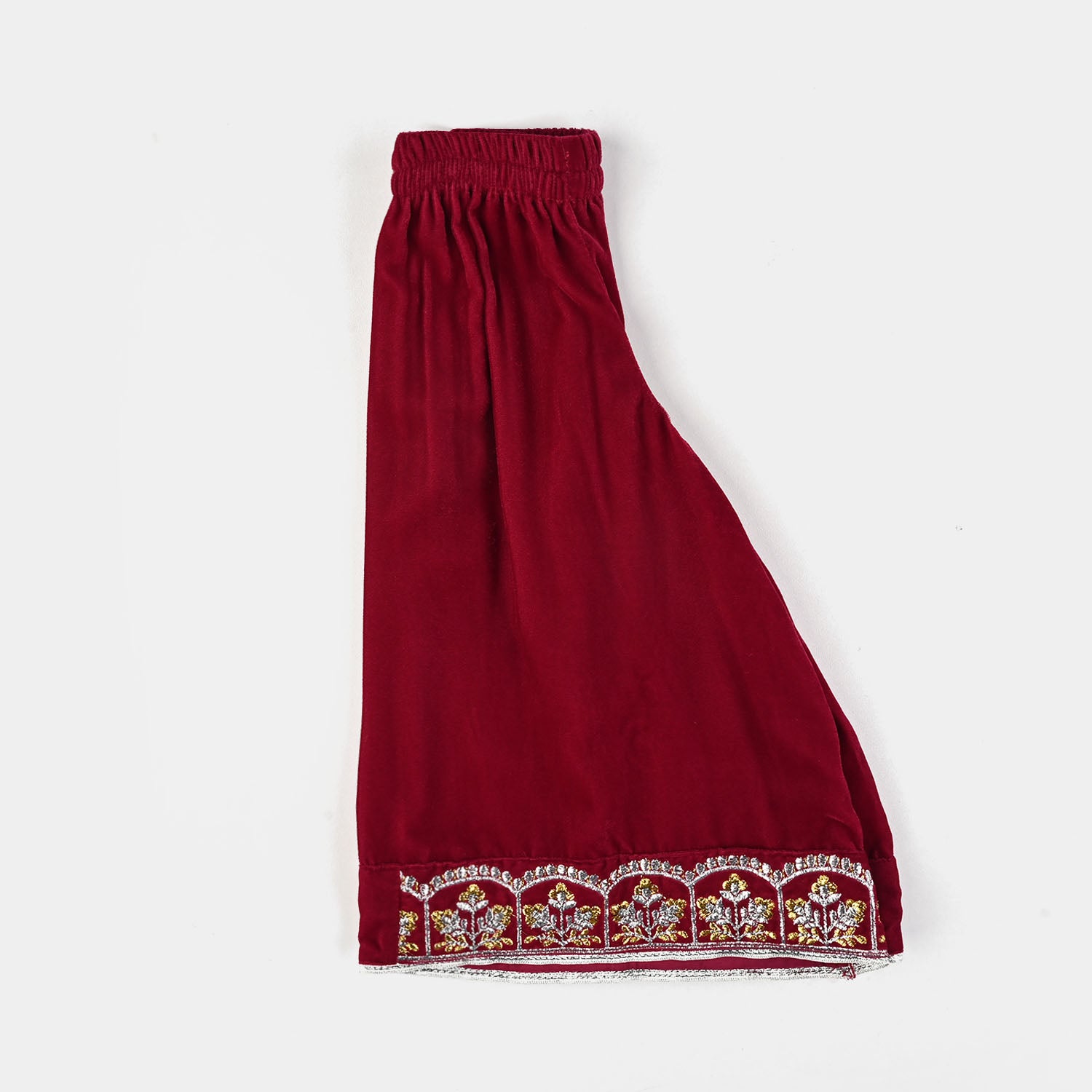 Velvet Fancy Suit in Magenta featuring an embroidered shirt with lace detailing, a round neck, and full sleeves. Paired with a matching bottom and a stylish slit for an elegant festive look.