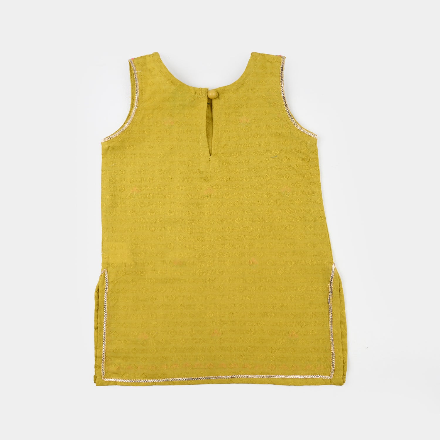 Infant girls' olive jacquard embroidered kurti featuring a round neck, sleeveless design, and delicate embroidery detailing, perfect for a graceful and comfortable everyday look.
