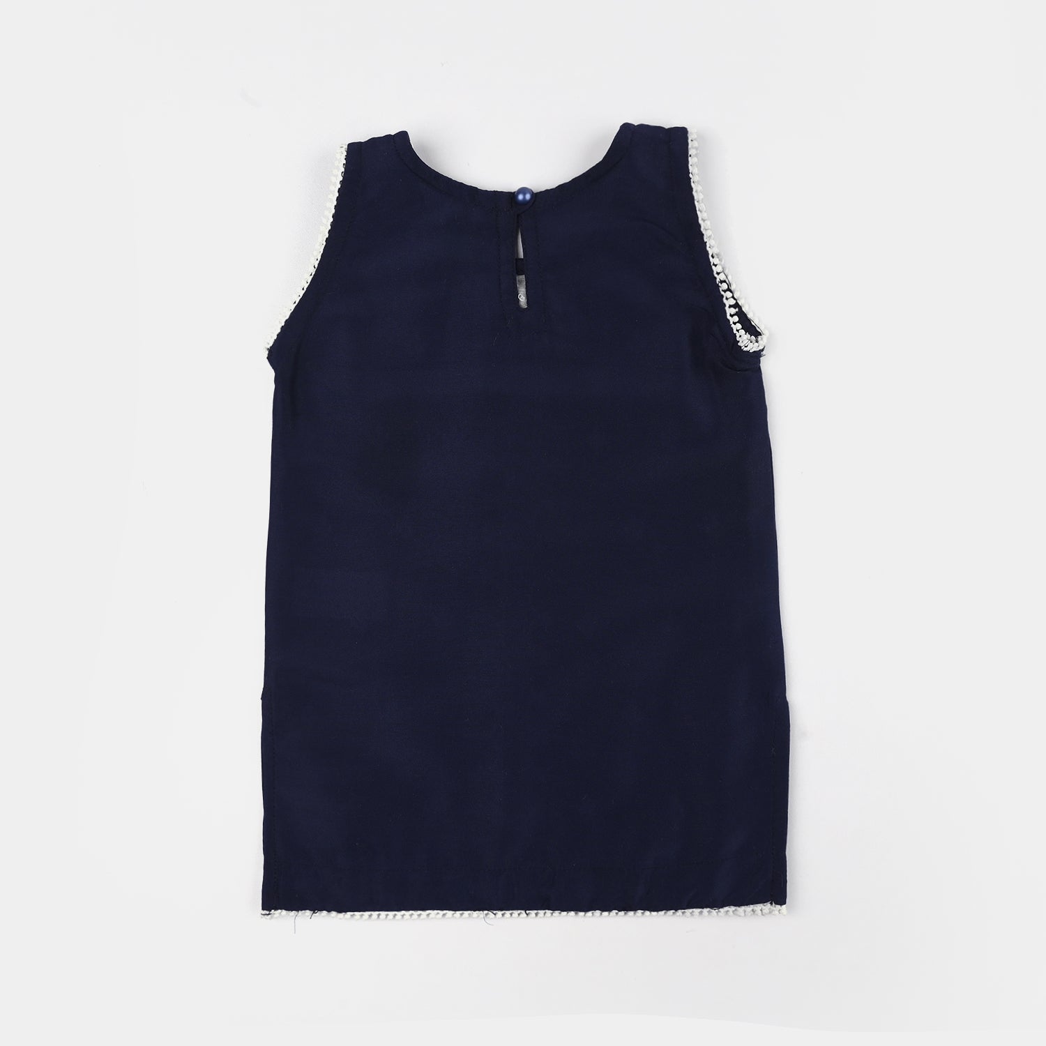 Infant girls' navy blue poly cambric embroidered kurti featuring a round neck, sleeveless design, and front button detailing, perfect for a stylish and comfortable everyday look.