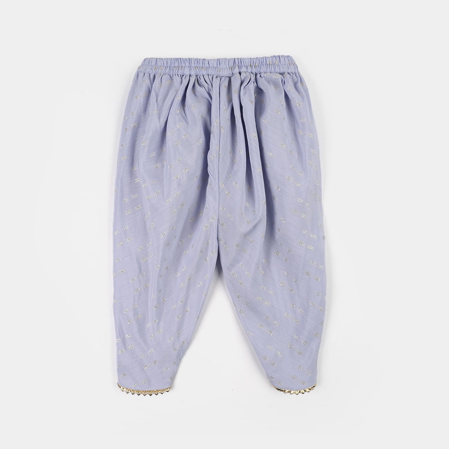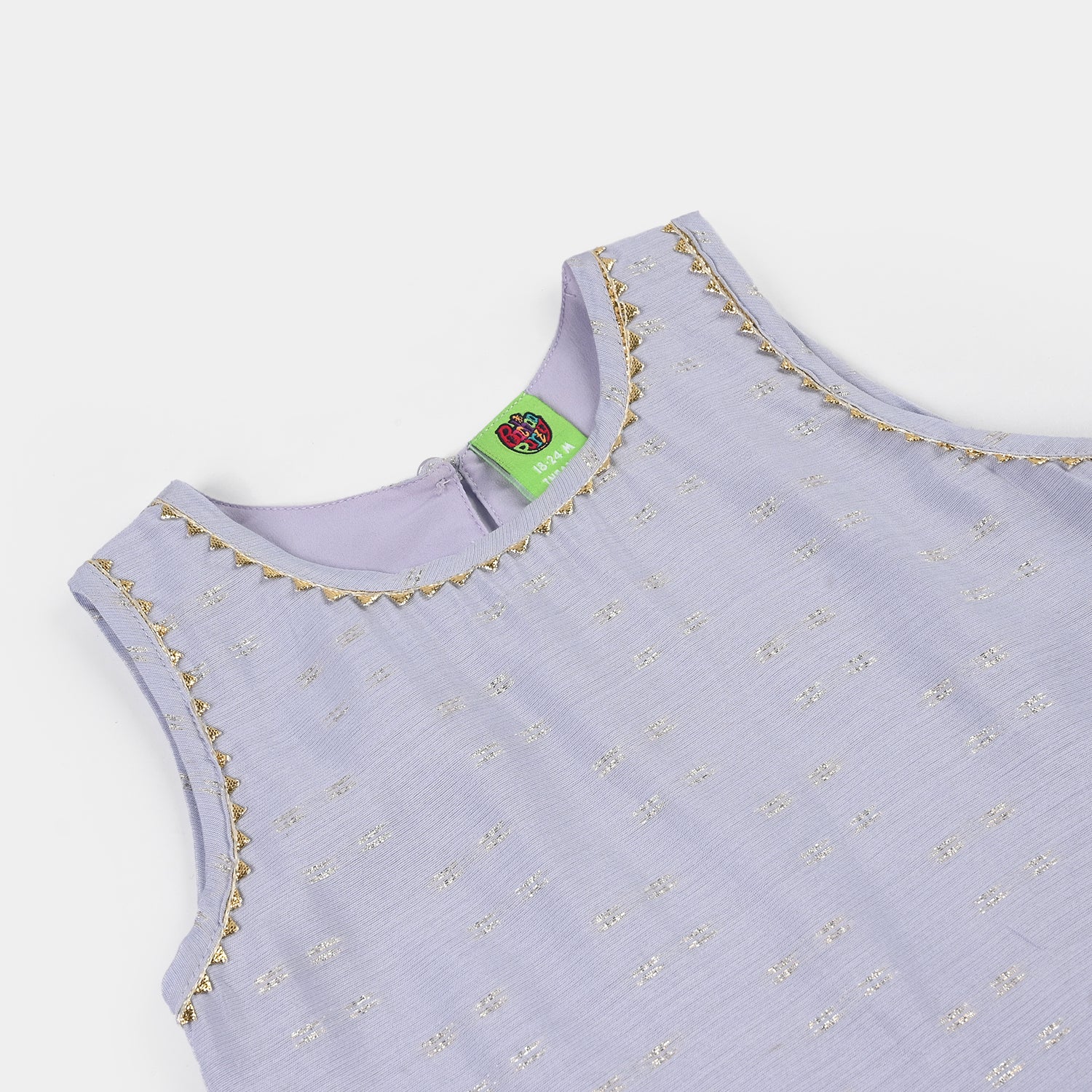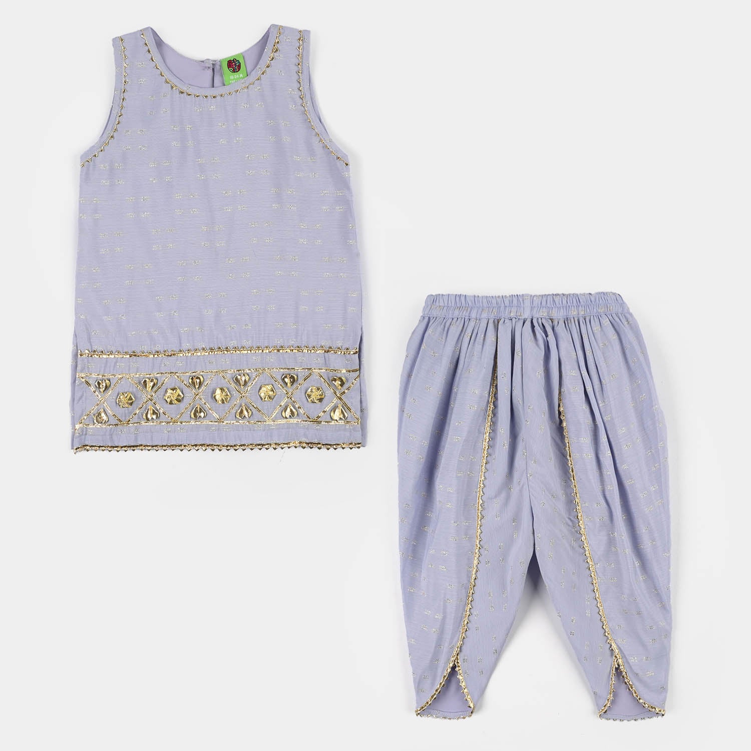 Infant girls’ jacquard 2-piece set in lilac featuring a round-neck sleeveless top and tulip pants with lace detailing, perfect for a stylish and comfortable everyday look.