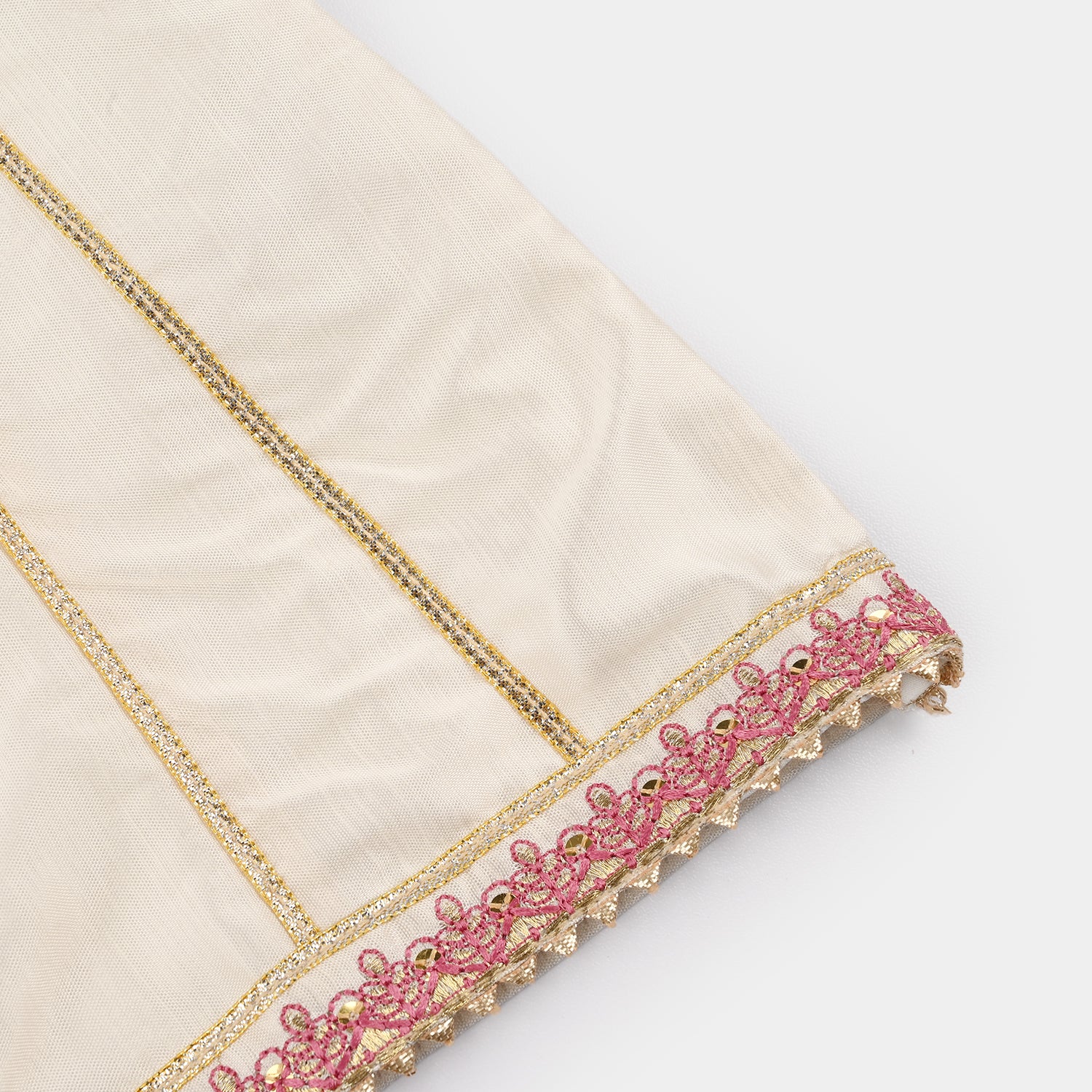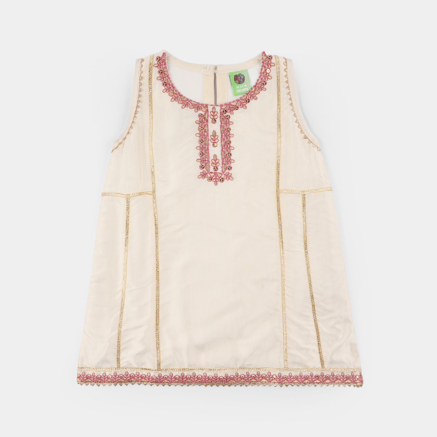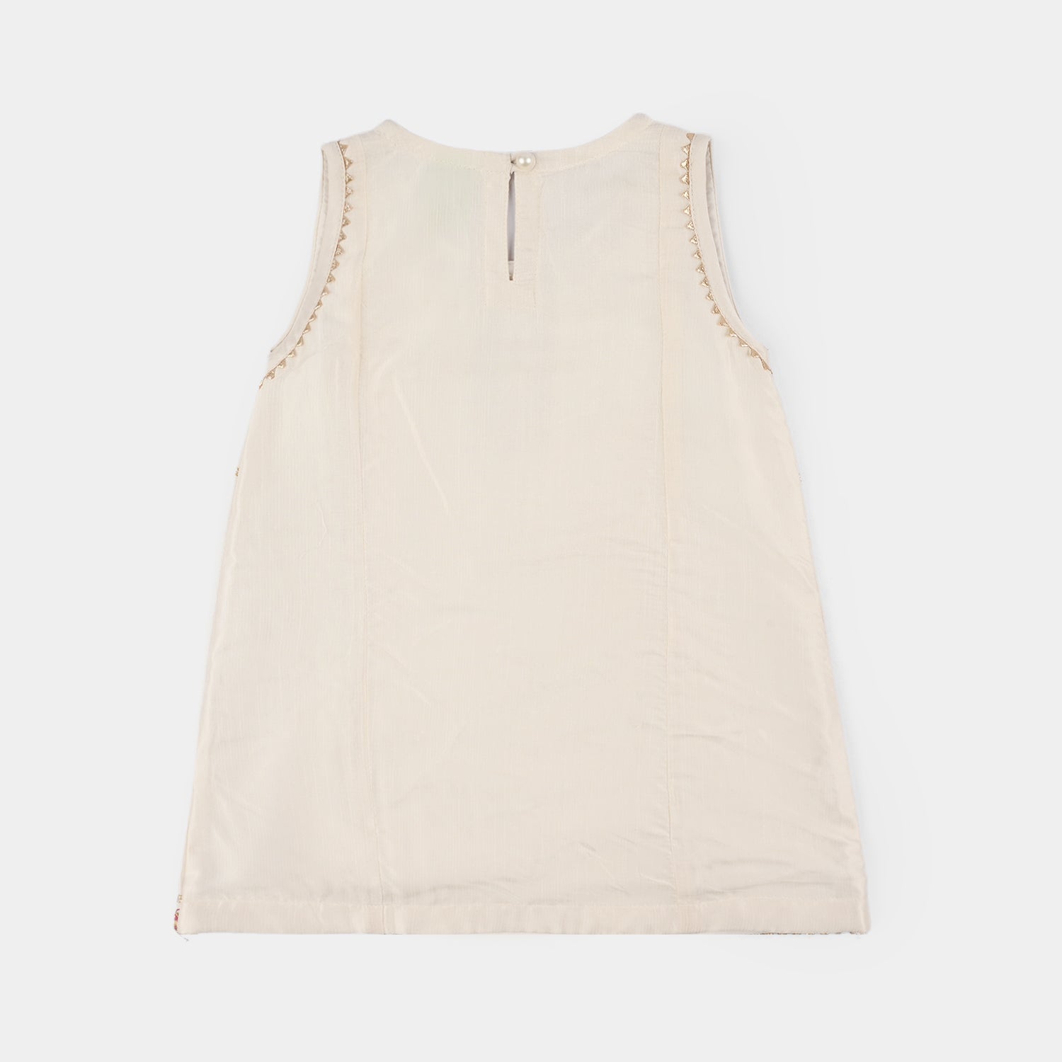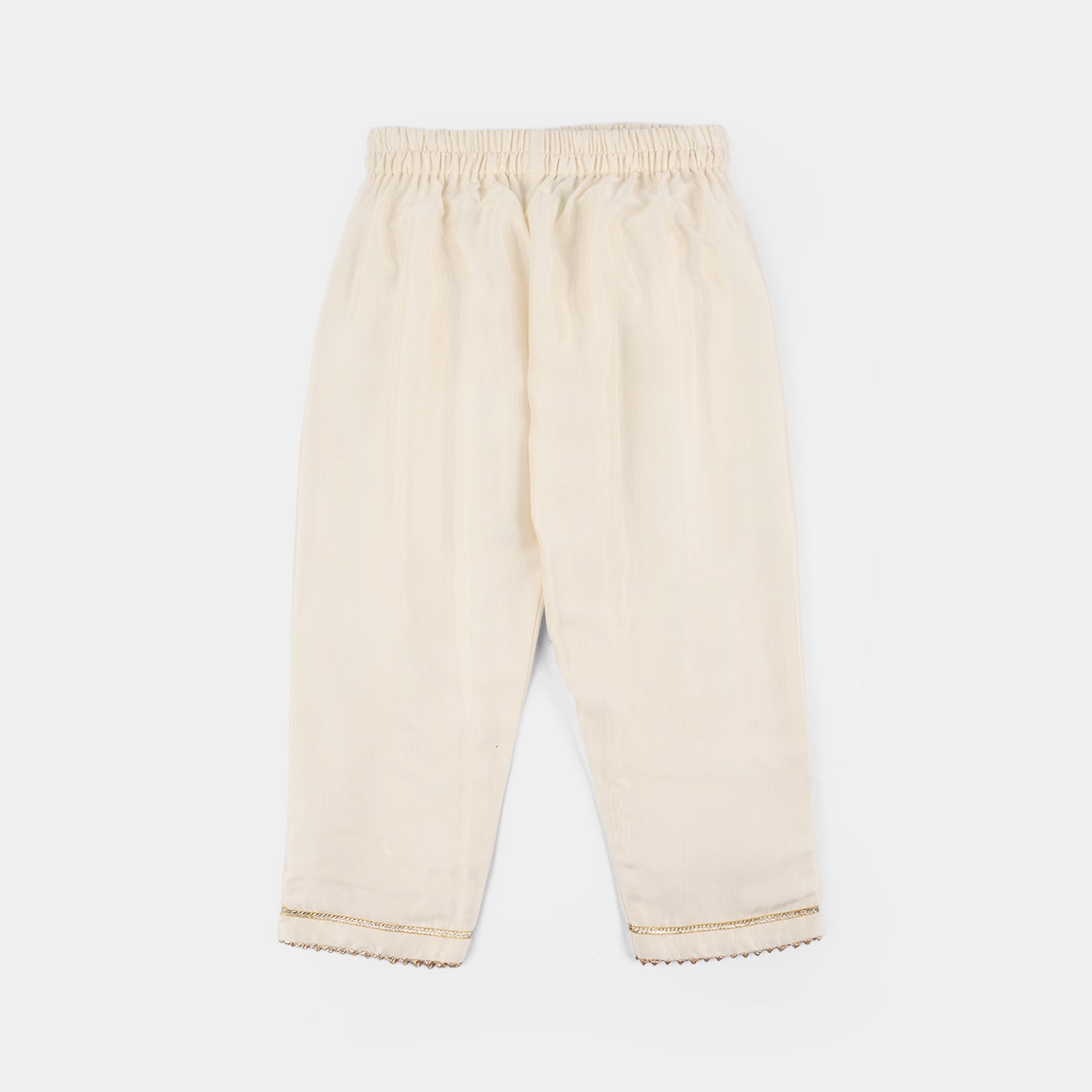 Infant girls' off-white raw silk 2-piece Pathani set featuring a round-neck, sleeveless top with lace and embroidery detailing, paired with matching bottoms, perfect for a stylish and comfortable everyday look.