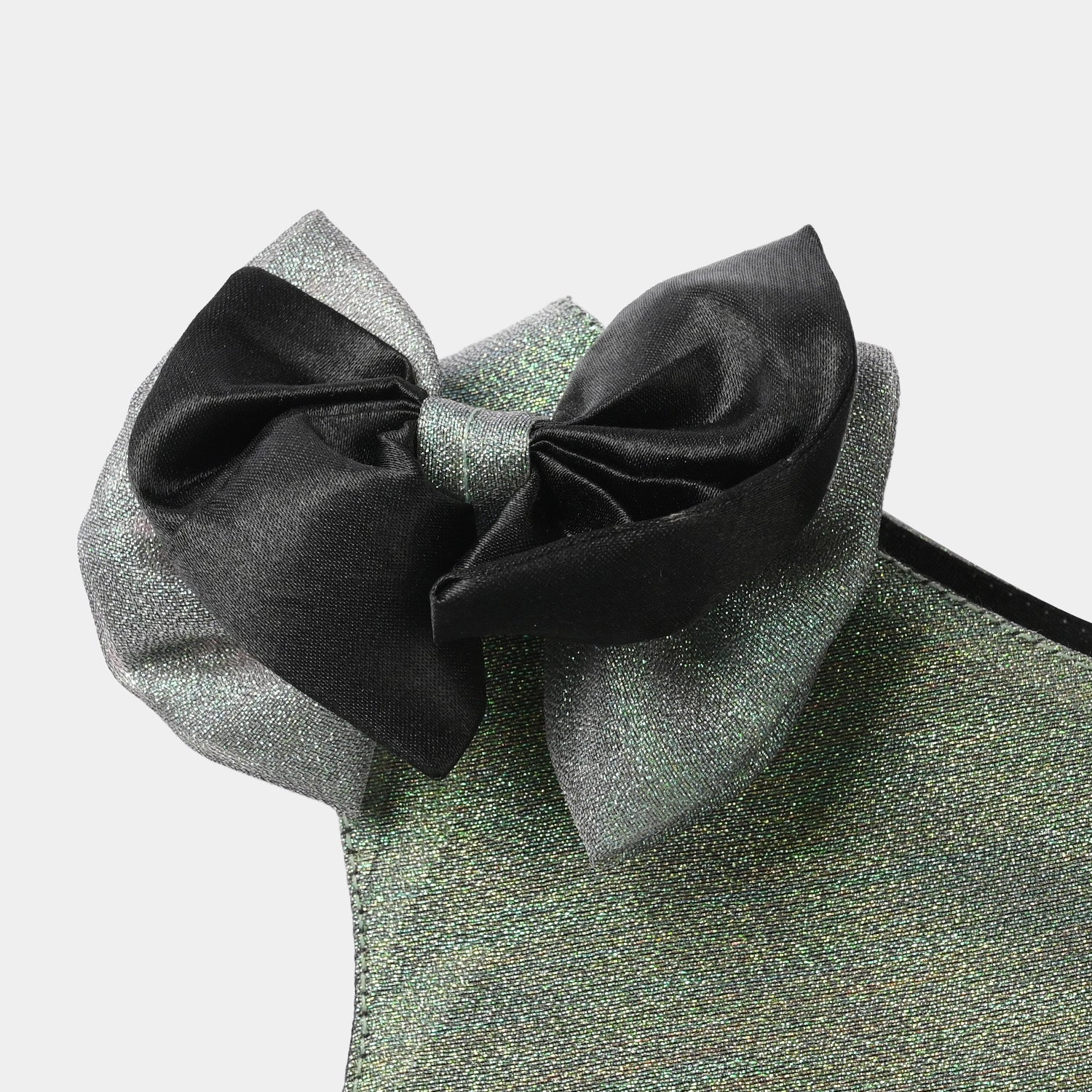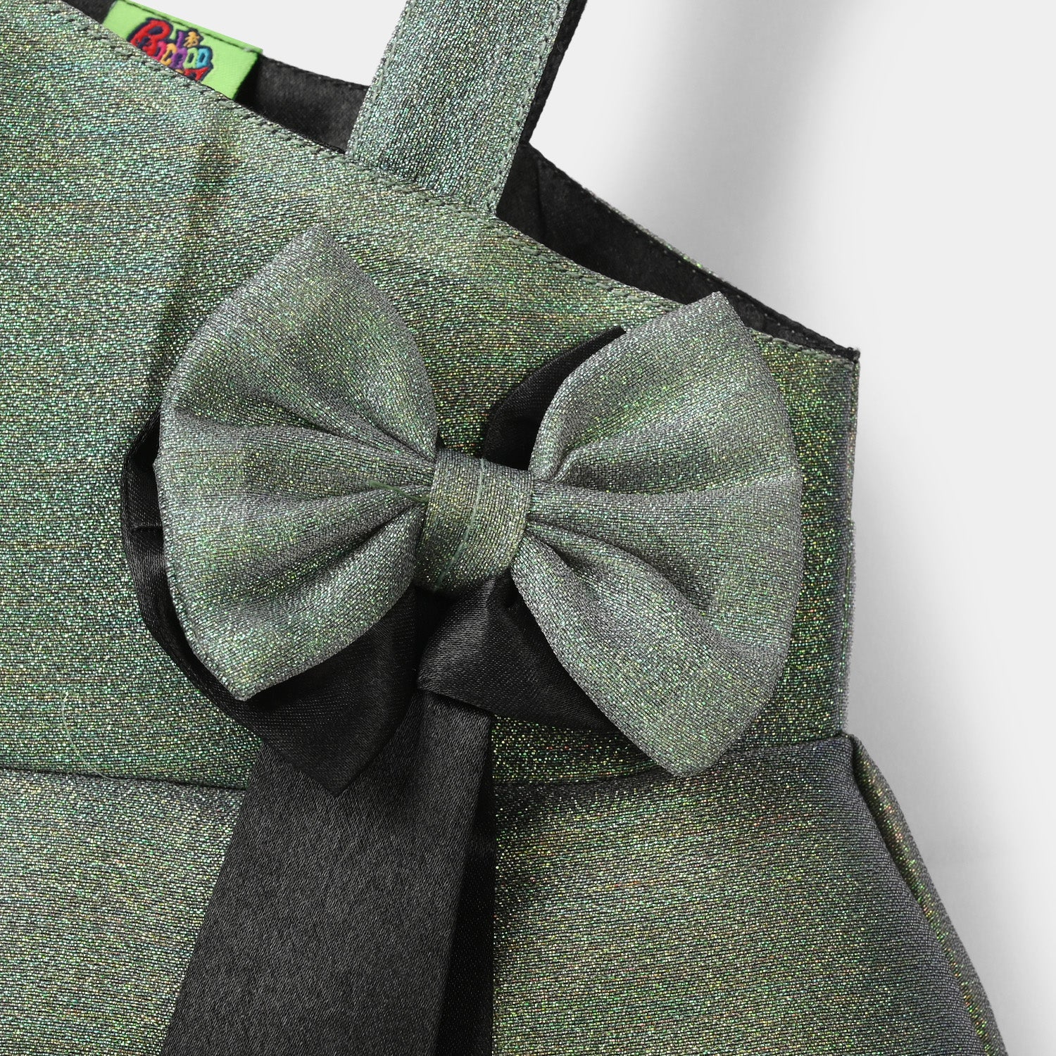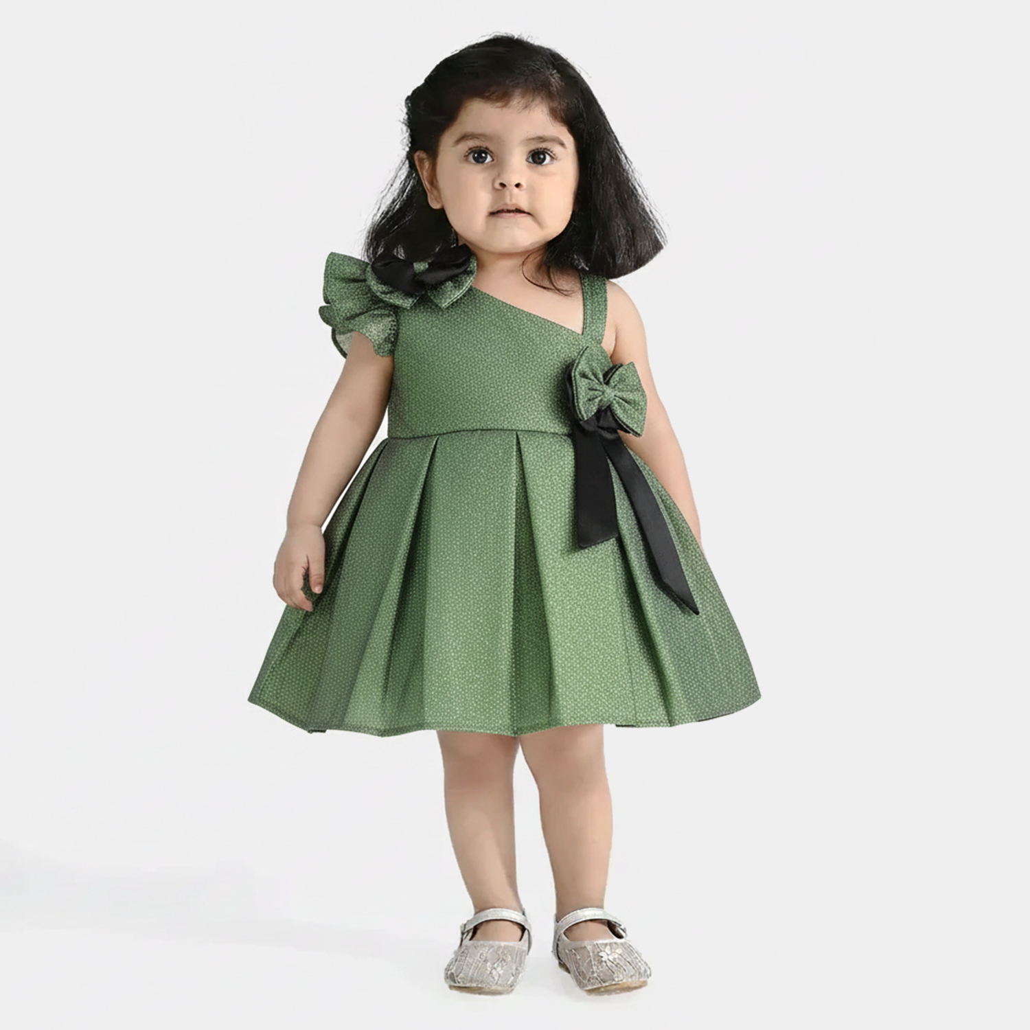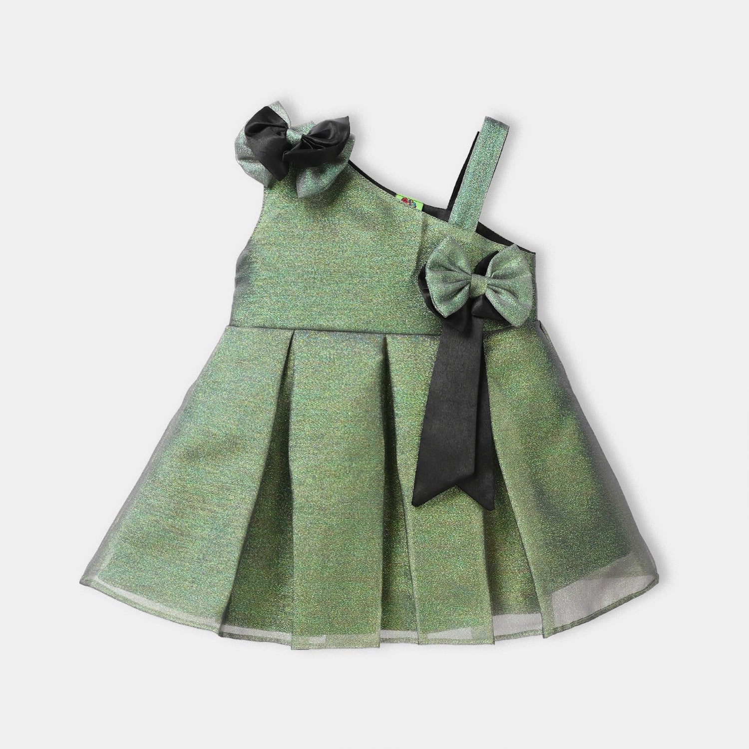 Infant girls green organza fancy frock with bow embellishments, stylish cuts, pleats, and a strap for a perfect and comfortable fit.
