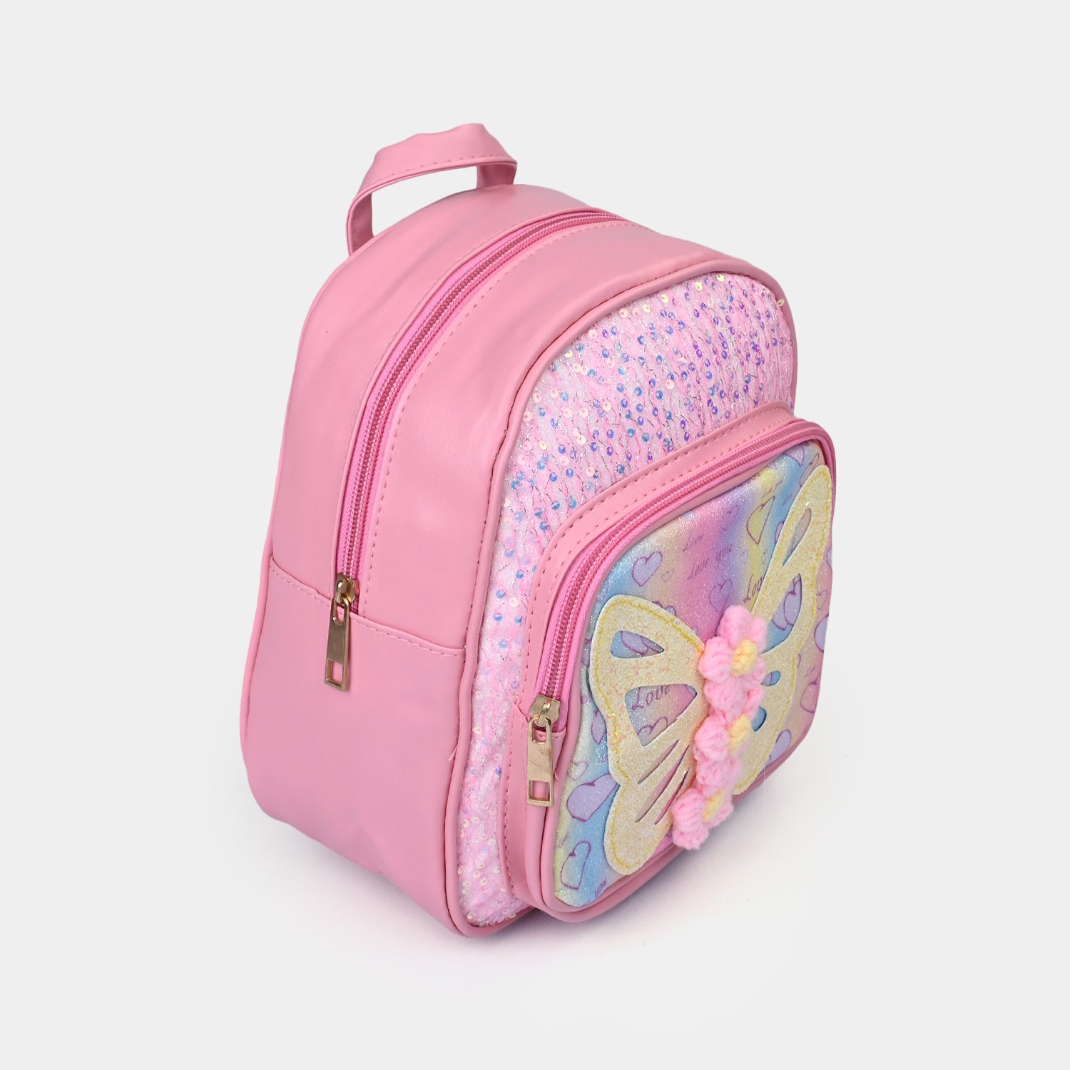 This pink backpack is covered in playful heart prints and a sparkling glitter finish. A colorful butterfly embellishment adds a fun and stylish touch.
