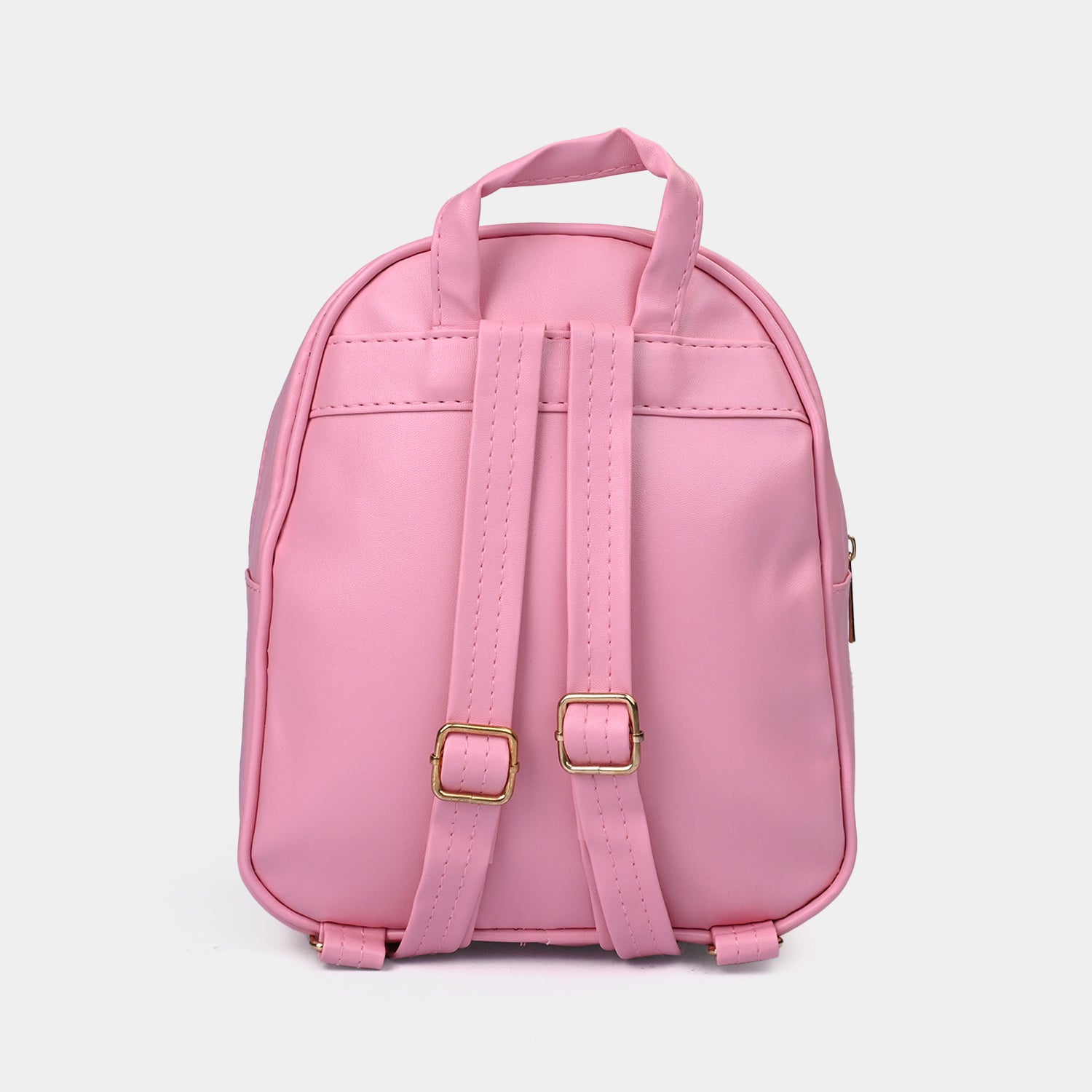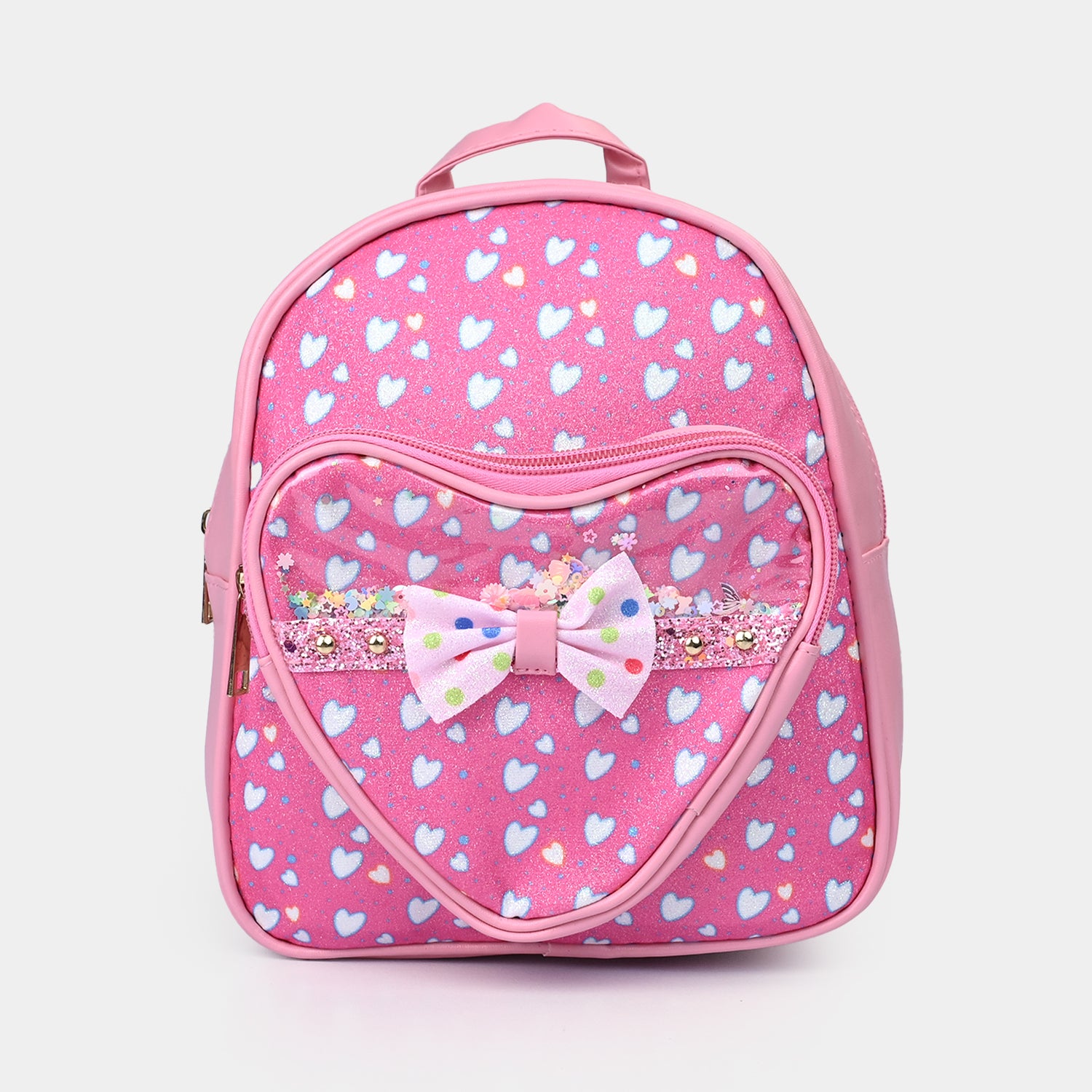 This pink backpack has heart prints with a glitter finish. The heart-shaped front pocket, adorned with a bow and pearl embellishments, adds a charming and stylish touch.