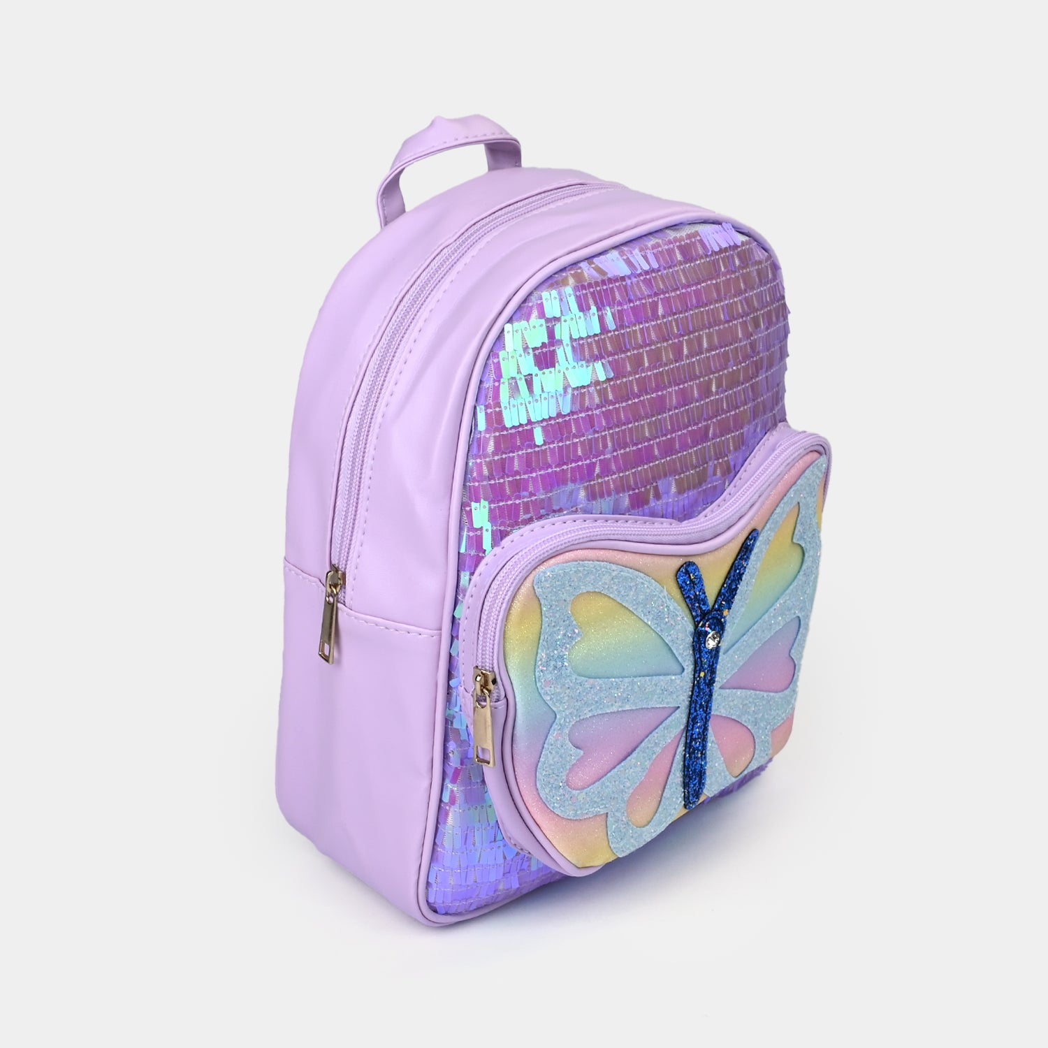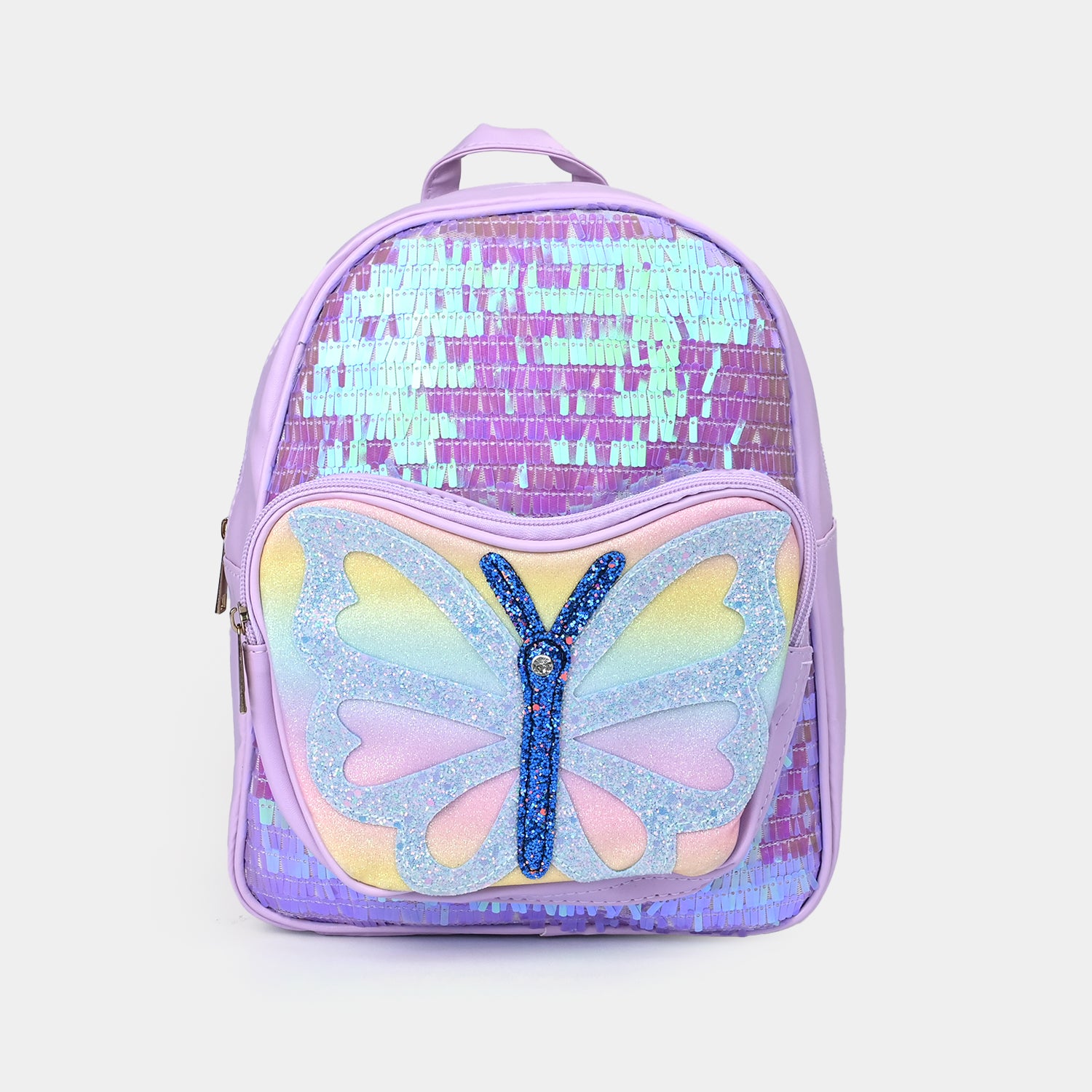 This purple backpack with glittery sequins features a cute butterfly on the front pocket. The butterfly sparkles in rainbow colors, adding a fun and magical touch.