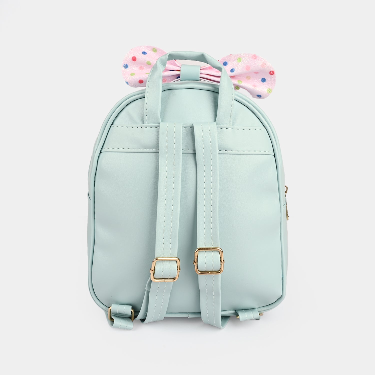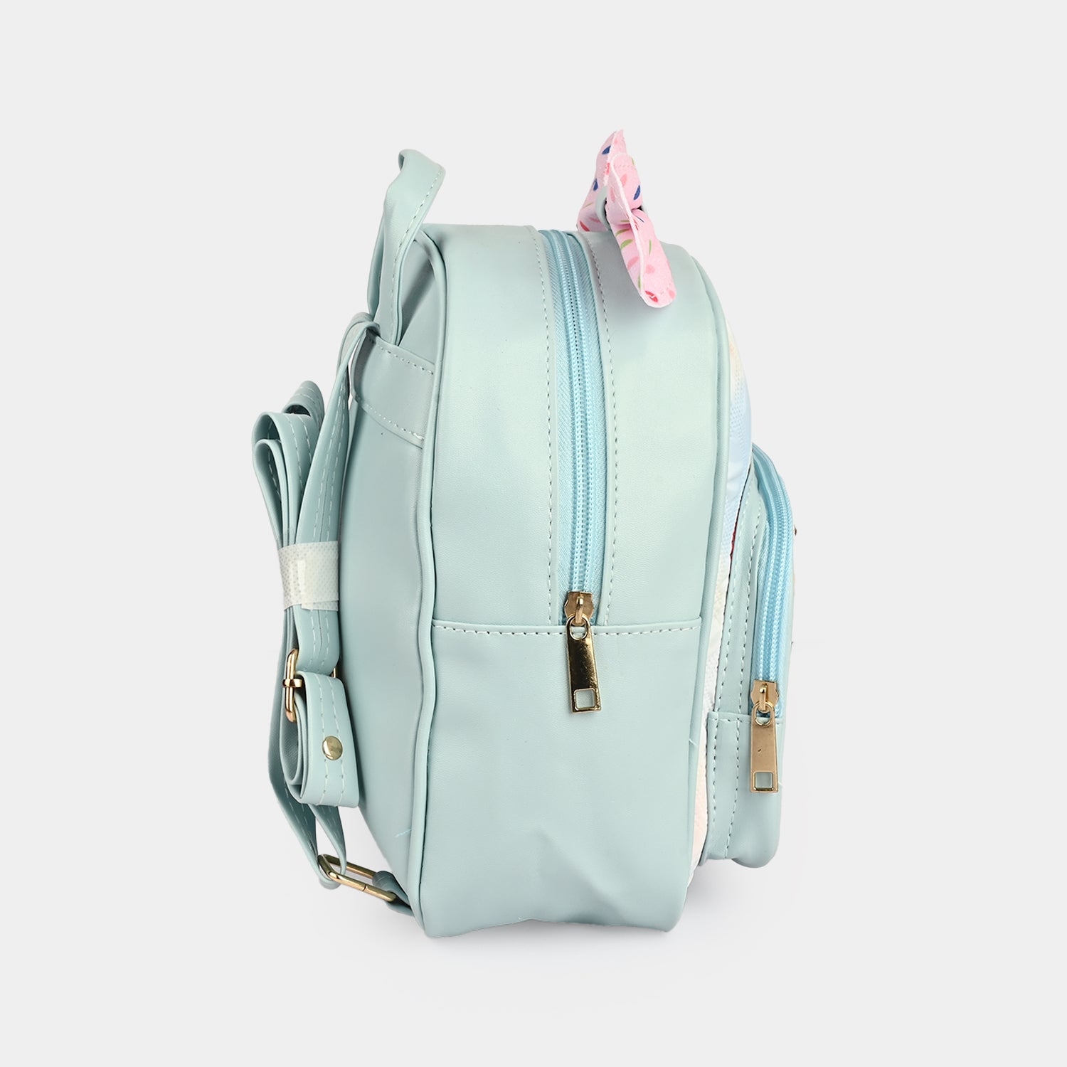 This blue backpack features a floral design with pearl detailing and a contrast pink bow with polka dot print, adding a cute and stylish touch.