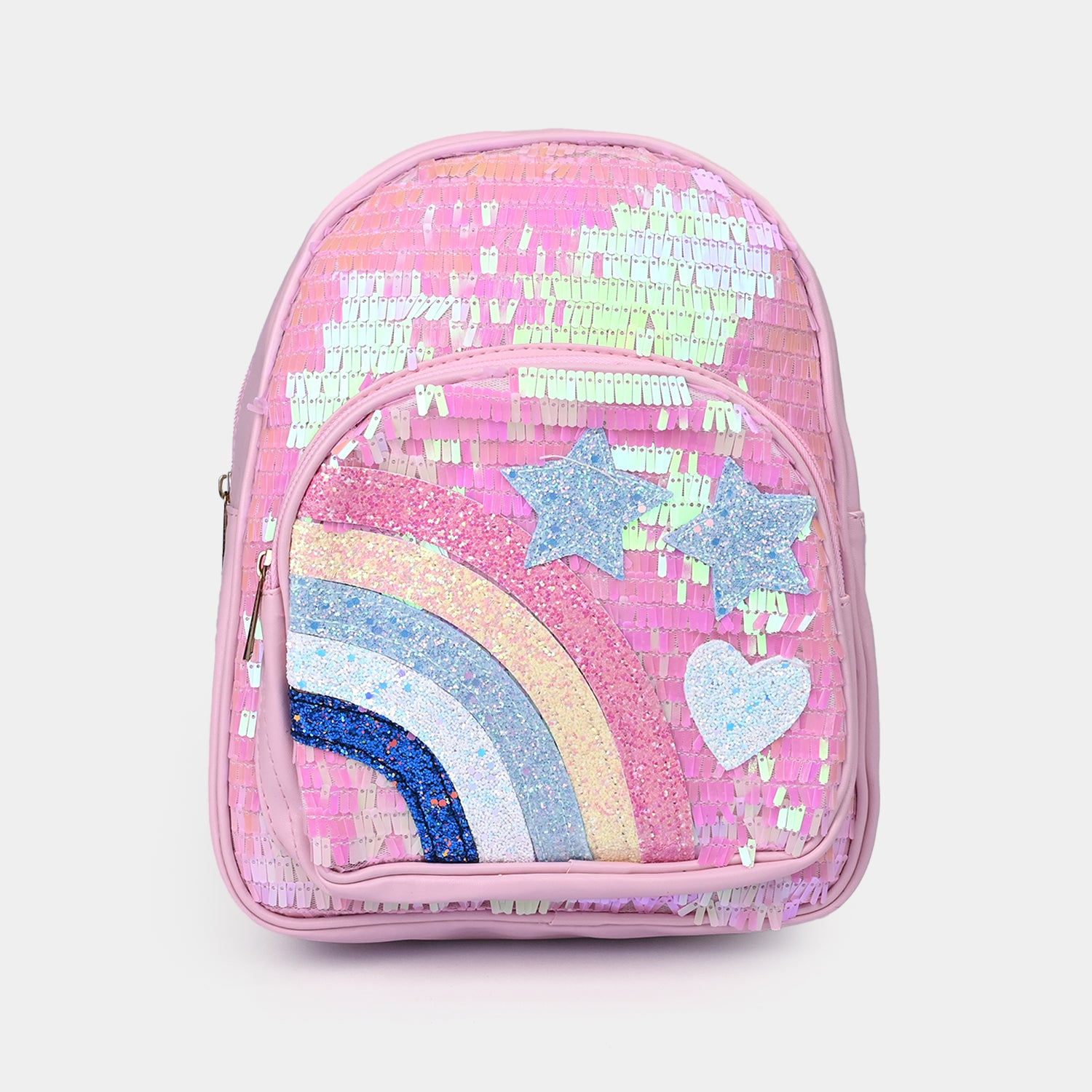 This cute pastel pink backpack features a rainbow theme with a shimmering sequin finish and heart and star embellishments on the front, adding a fun and playful sparkle with every move.