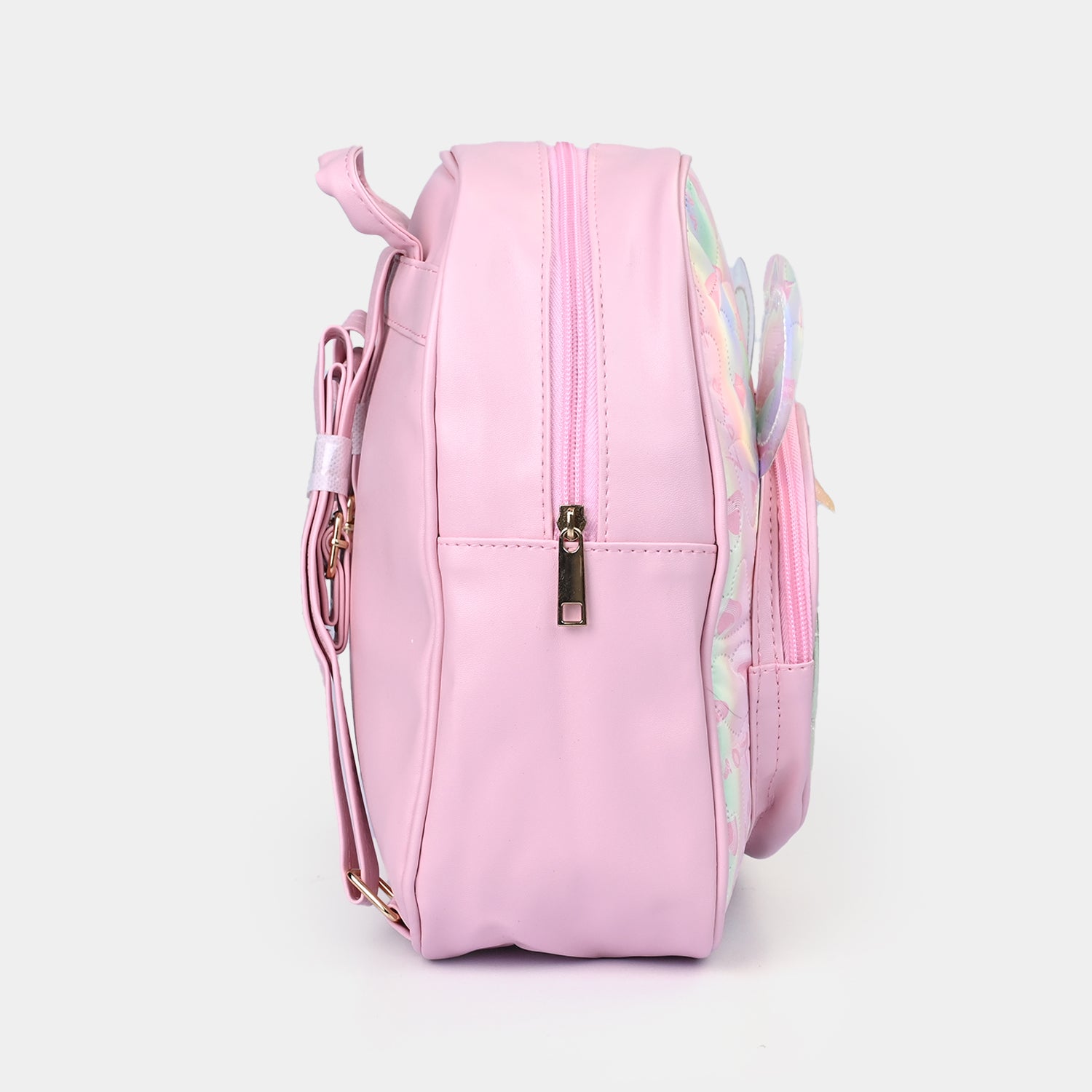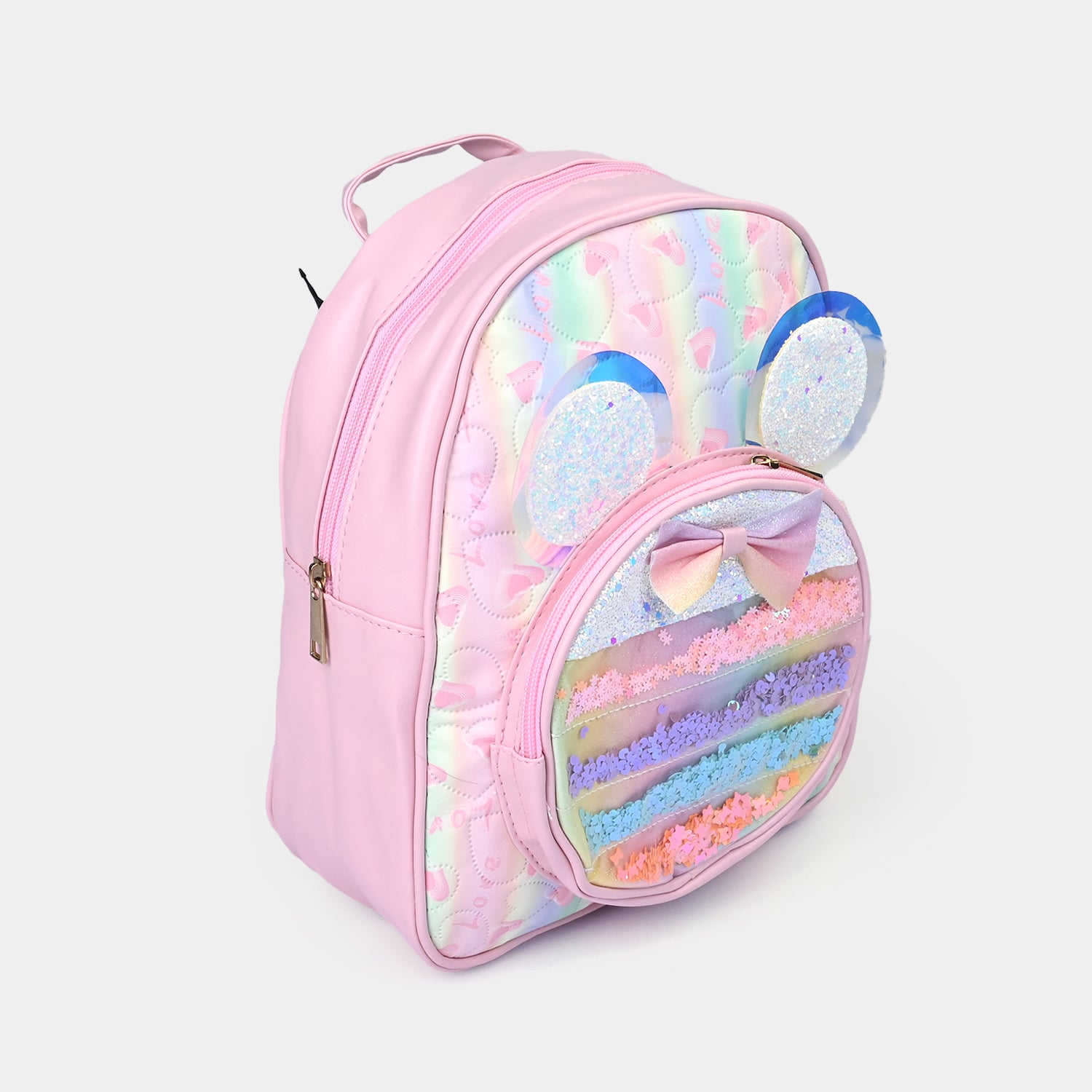 This cute pastel pink backpack features a Mickey-shaped pocket with glittery ears and a rainbow bow. The front is filled with colorful, shimmering sequins that sparkle with every movement. It's a fun, playful design!