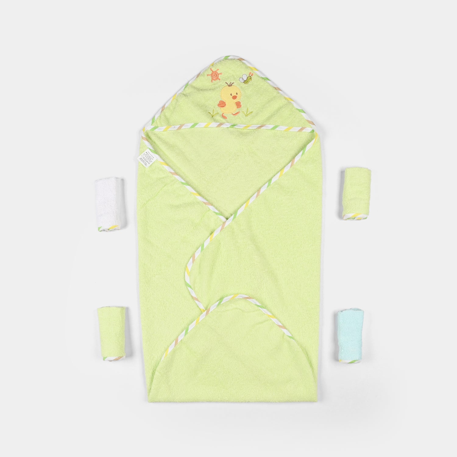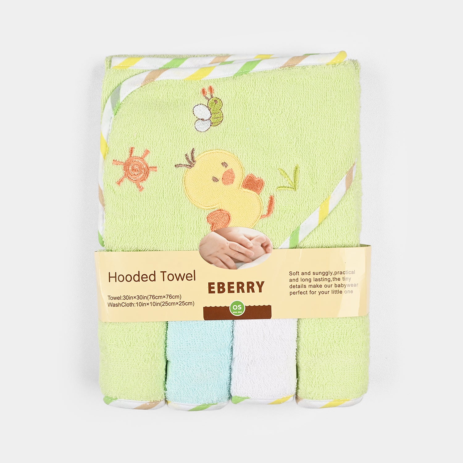 This set includes a snug hooded bath towel for post-bath coziness and four gentle face towels to pamper your baby. These towels are perfect for bath time, mealtime, or just a quick clean-up, and they make every moment with your baby extra convenient and utterly cute.