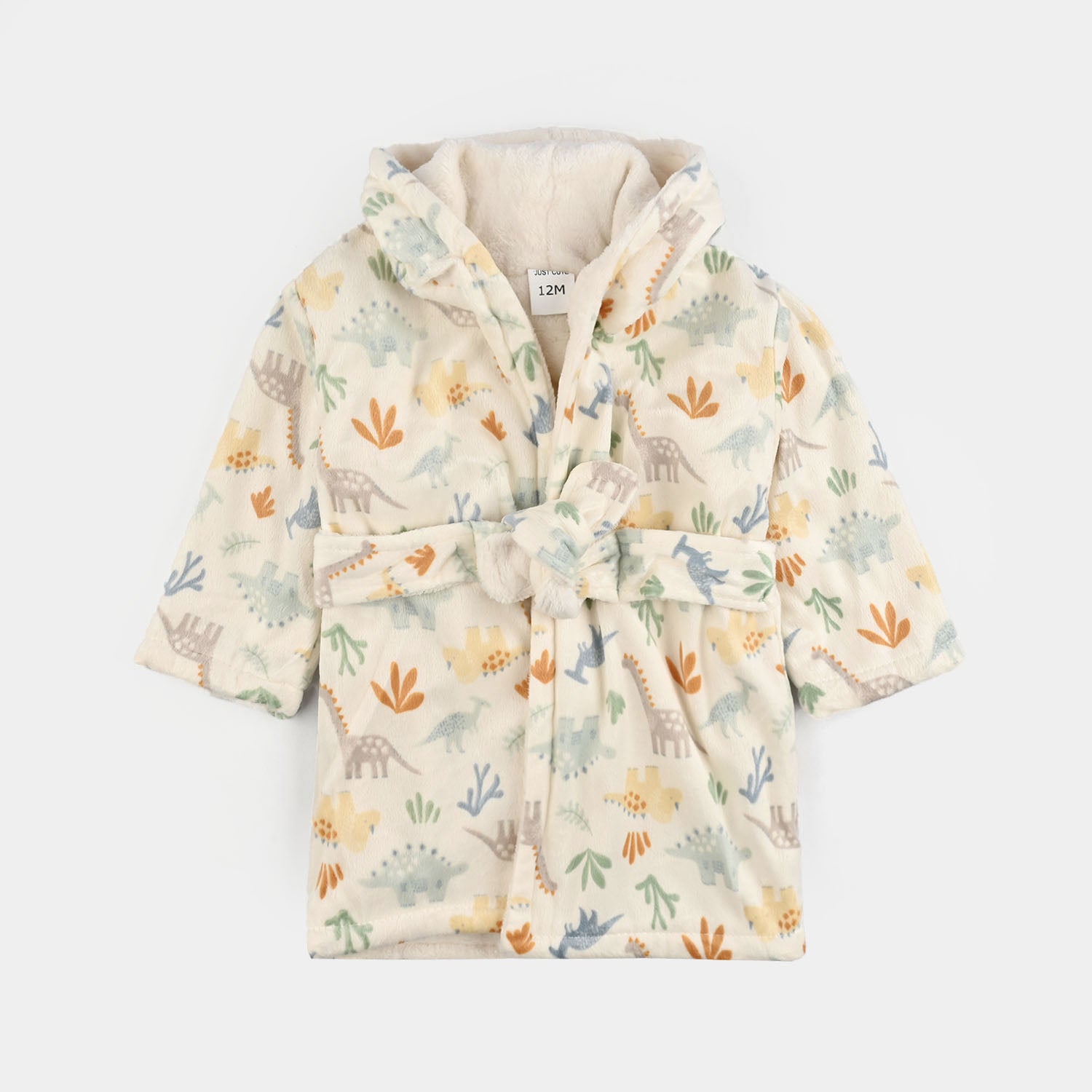 This baby bath gown, made from soft fur material, keeps your little one warm and dry after bath time. It has a cozy hood and a secure waist tie for a snug, comfortable fit.