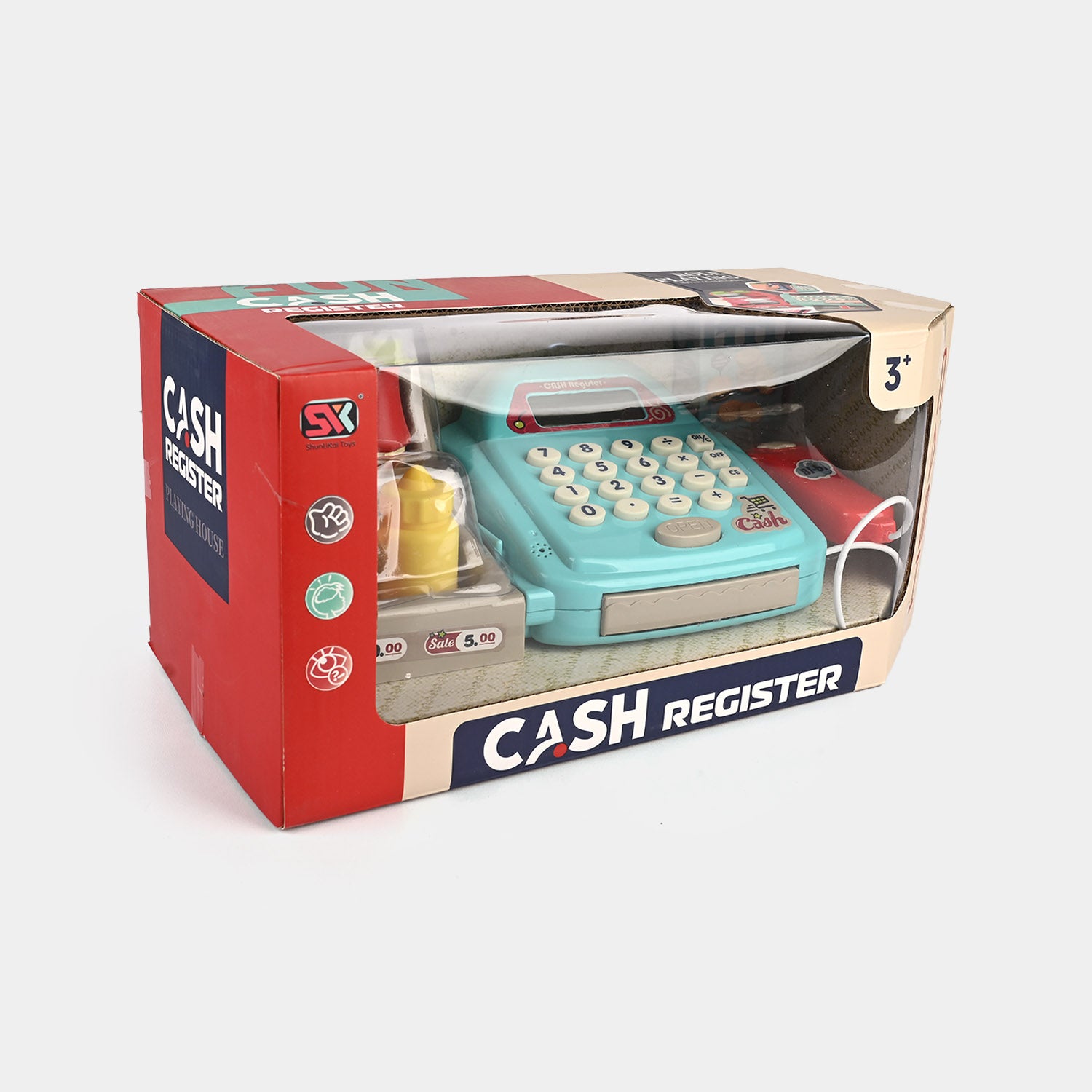 Children's pretend play cash register toy set. This interactive playset is designed for role-playing games and typically includes a toy cash register with a functional calculator, a handheld scanner with lights and sounds, a cash drawer, play money, and various toy grocery items.