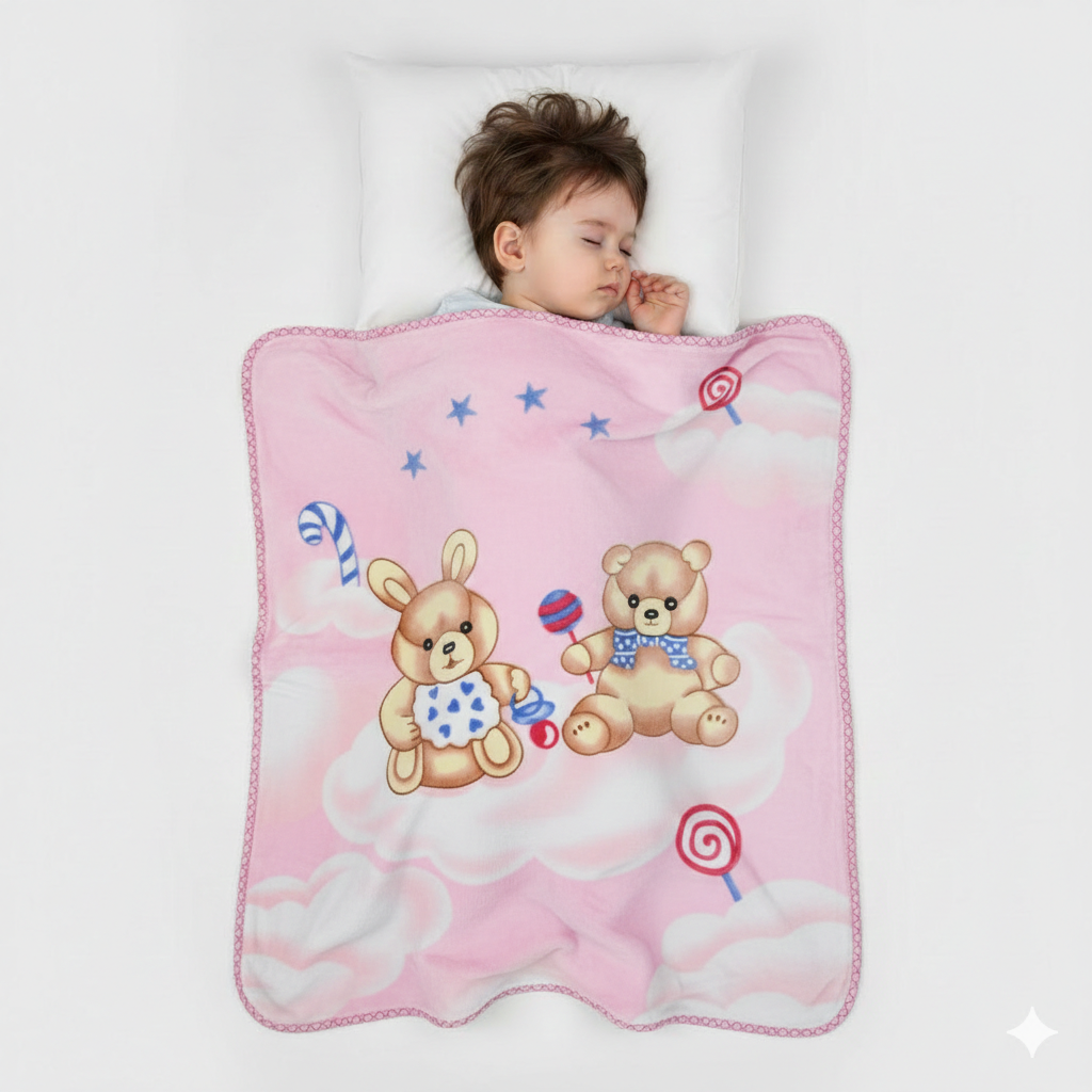 Wrap your little one in warmth and softness with this pink fleece teddy-themed baby blanket. Soft, cozy, and eye-catching, it’s perfect for naptime, bedtime, or on-the-go cuddles, keeping your baby comfortable and happy.