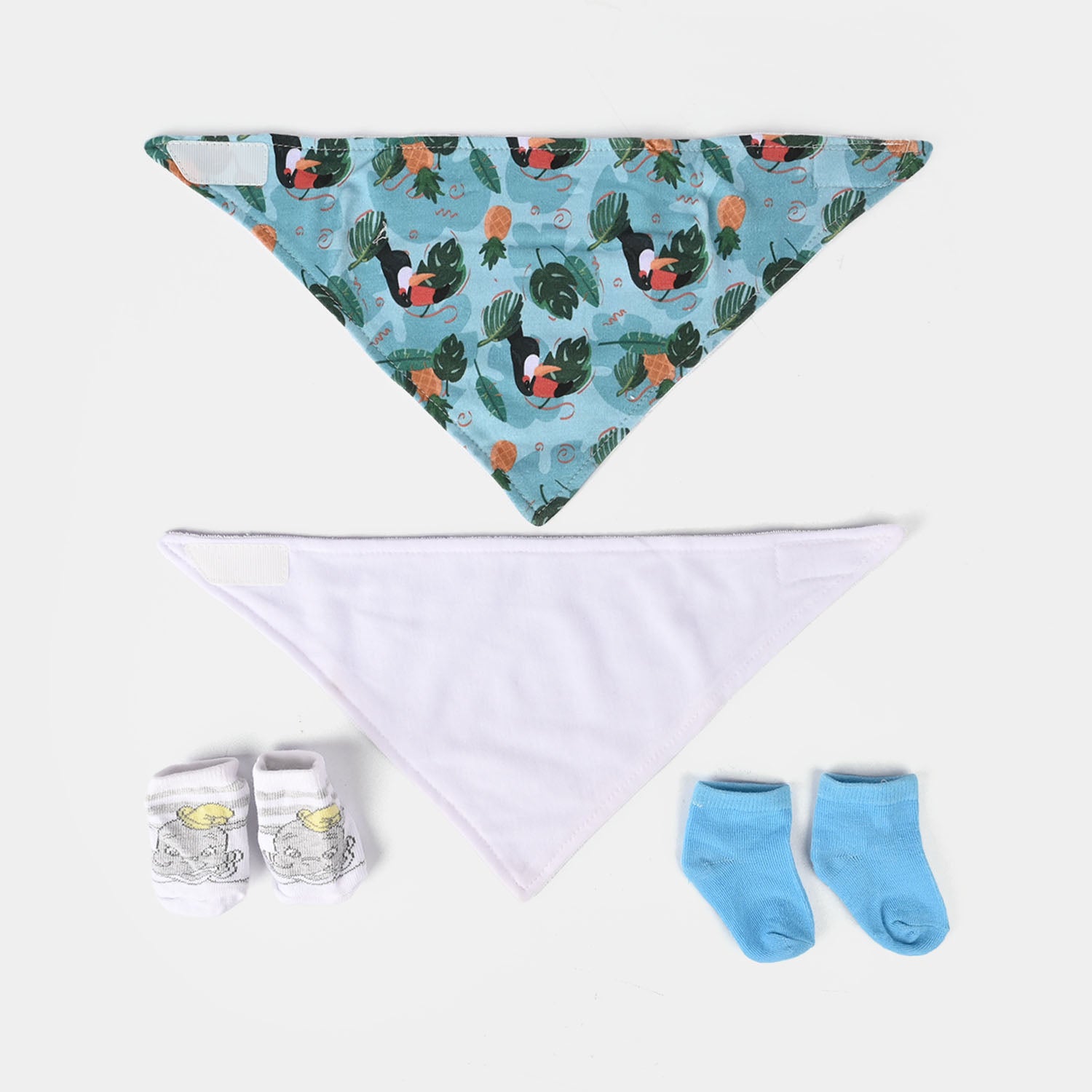 Soft and practical 4-piece set for newborns, featuring two absorbent bandana bibs and a warm pair of socks. Gentle on sensitive skin and ideal for daily wear.