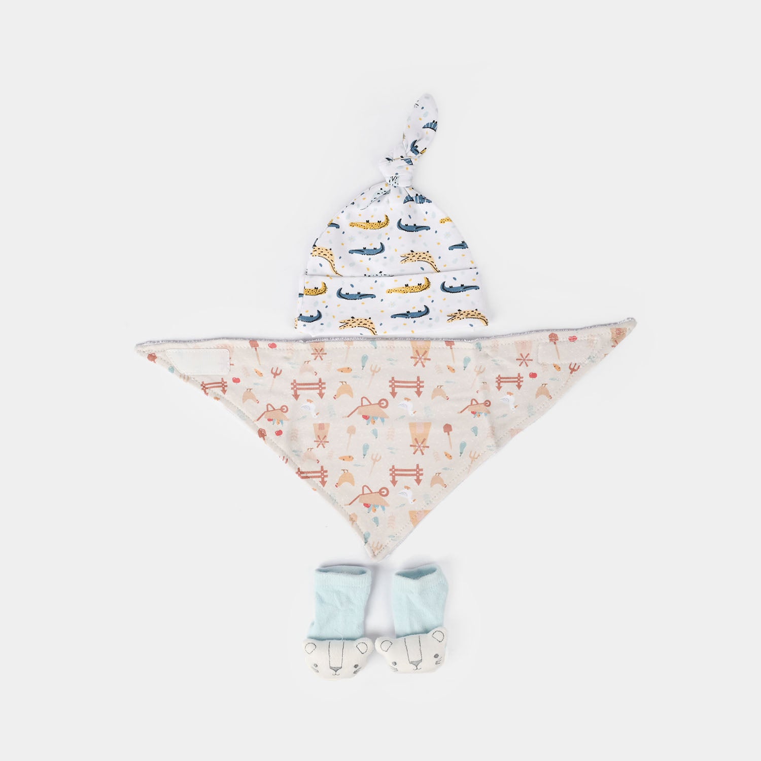 Soft, practical 3-piece set for newborns featuring a cozy cap, absorbent bandana bib, and warm booties. Gentle on sensitive skin and ideal for daily wear or hospital bags.